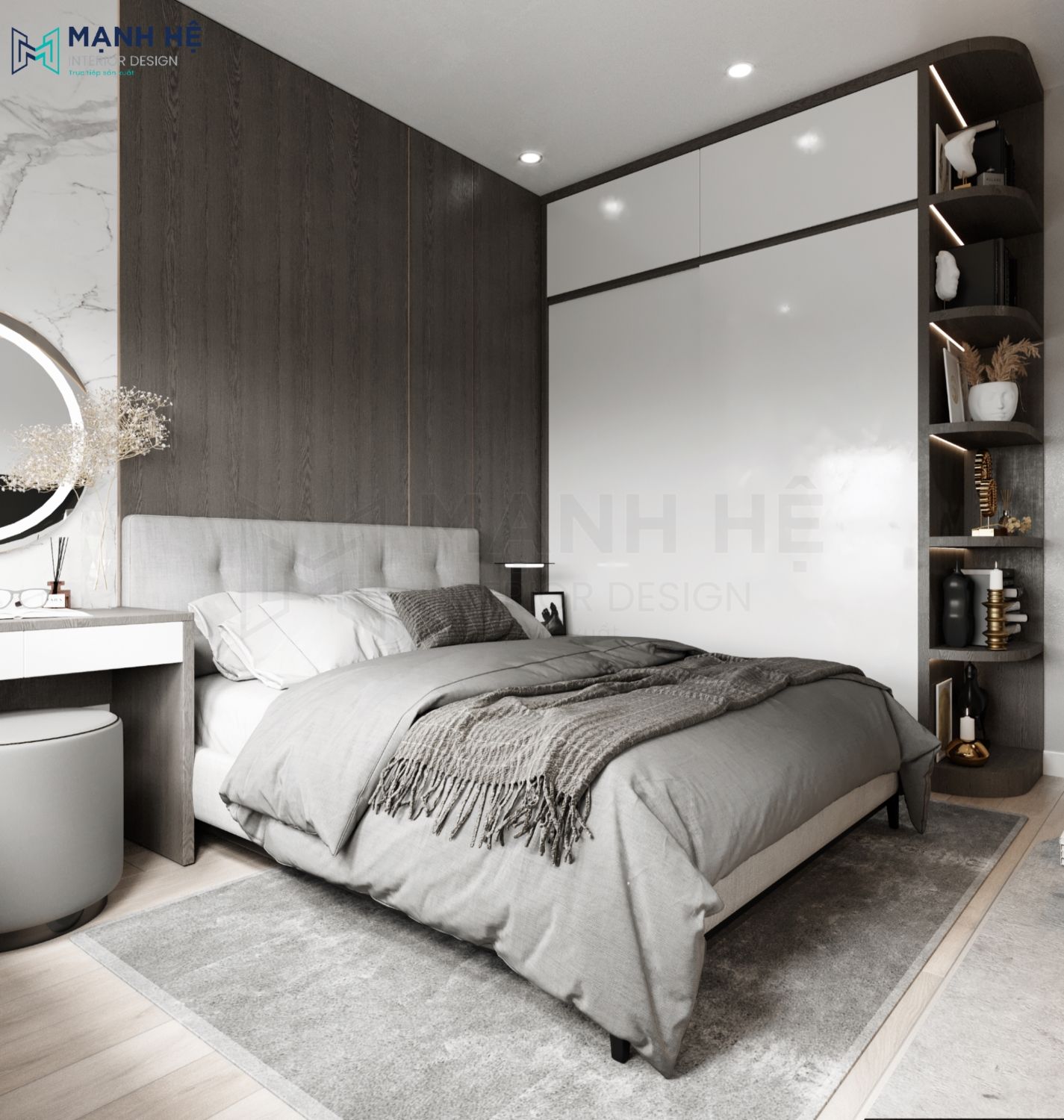 Phòng ngủ ấm áp và sang trọng với vách đầu giường ốp gỗ mà tối, phía bên cạnh là bàn trang điểm được ốp đá làm nổi bật và tăng lên vẻ đẹp cho căn phòng.