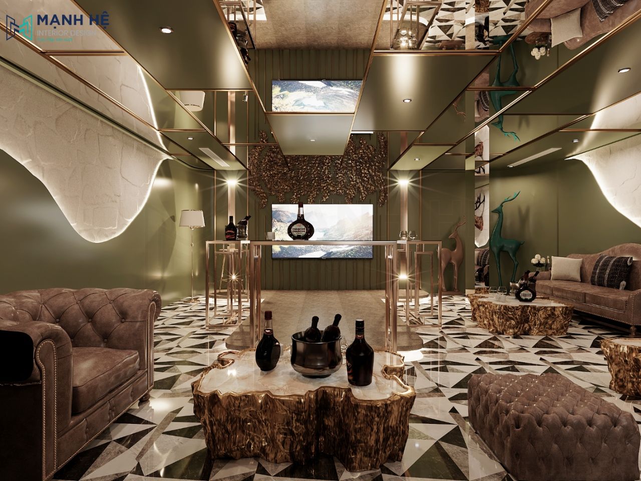 Phòng karaoke vốn là nơi sôi nổi, năng động nên việc thiết kế có phần hiện đại cũng giúp khách hàng cảm thấy thoải mái nhất cũng là mục đích mà khách hàng thiết kế ra phòng kara này. Với trần nhà được thiết kế hình ô chữ nhật phối giữa mặt kính và mặt thạch cao làm tăng chiều sâu căn phòng, kết hợp với các mảng tường được Mạnh Hệ thiết kế với các đường cong lạ mắt gắn đèn led uốn lượn theo đó giúp cho căn phòng thêm nổi bật và hiện đại hơn.