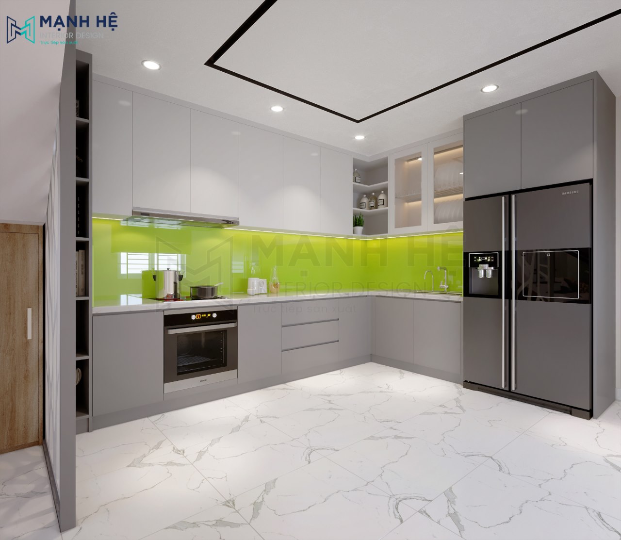 Hệ tủ bếp gỗ công nghiệp chữ L với ốp kính màu xanh lá cây nổi bật. Các ngăn hộc tủ làm nơi lưu trữ đồ khô và chén bát tiện nghi cho gia chủ. Tích hợp thêm tủ bao tủ lạnh vào chung hệ tủ bếp.