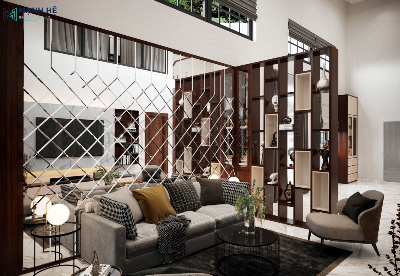 Thiết kế nội thất phòng khách với gam màu nâu gỗ là gam màu chủ đạo, toát lên vẻ đẹp sang trọng, thời thượng. Bố trí bộ sofa bọc nhung cùng bàn trà đơn giản để Gia chủ thuận tiện tiếp khách cũng như nghỉ ngơi. Bên cạnh đó, ốp kính thủy lớn cho phòng khách giúp tạo chiều sâu không gian, kết hợp cùng hệ thống rèm cửa 2 lớp tối ưu ánh sáng tự nhiên mang đến cảm giác thoải mái, dễ chịu mỗi khi bước vào căn phòng.