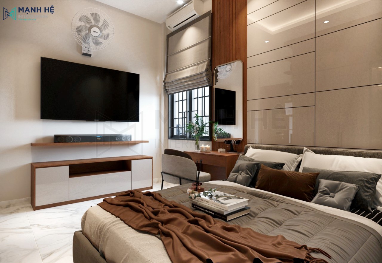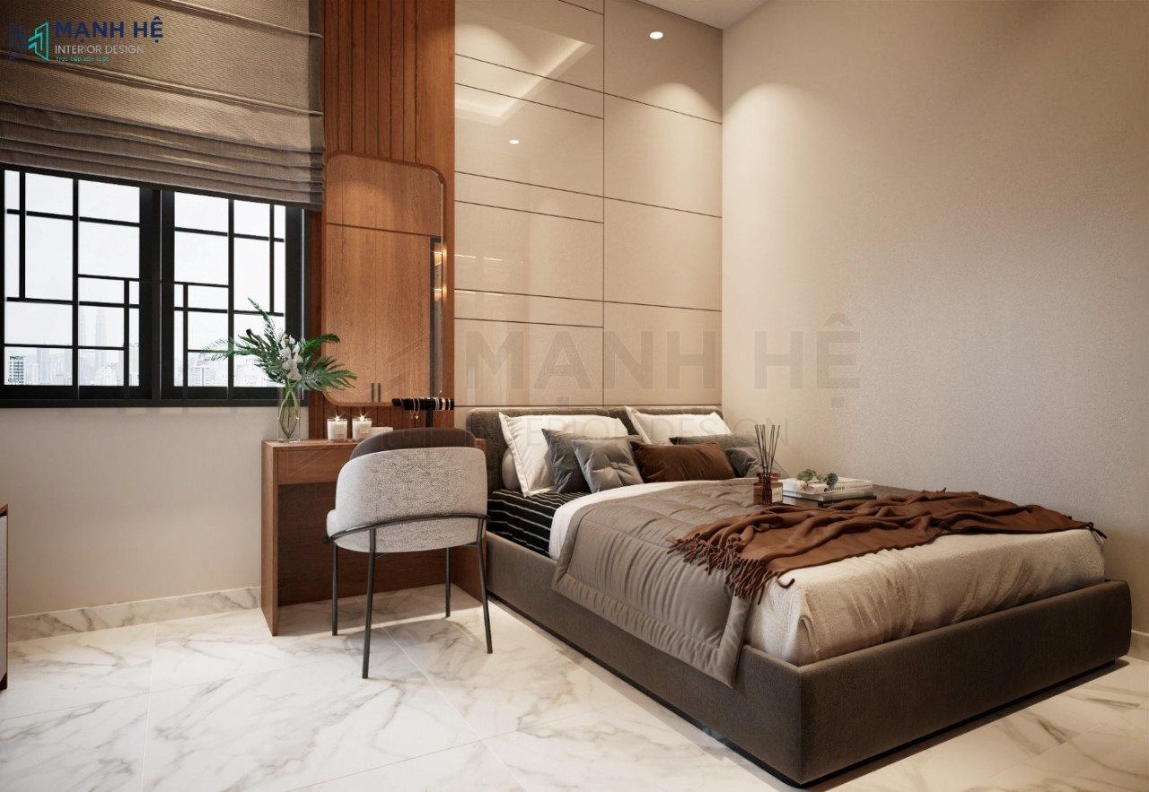 Thiết kế nội thất phòng ngủ master cho Gia chủ với gam màu nâu gỗ mộc mạc là gam màu chủ đạo mang đến cảm giác ấm áp. Bố trí giường ngủ bọc nhung sát tường giúp cho không gian rộng rãi hơn. Đầu giường sử dụng vách ốp gỗ Acrylic bóng gương sang trọng tạo điểm nhấn cho tổng thể.
