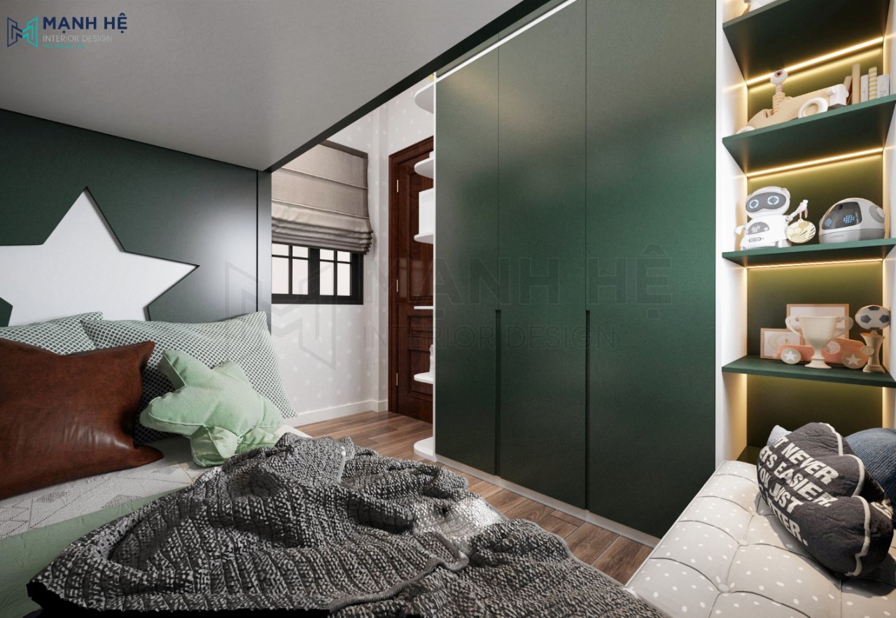 /phong-ngu-be-trai tiện nghi, hiện đại để bé có không gian học tập và vui chơi thoải mái. Sử dụng giường tầng được làm từ gỗ cao cấp đảm bảo an toàn, chắc chắn trong quá trình bé sử dụng. Hệ giường tầng có màu trắng kết hợp cùng màu xanh rêu độc đáo tạo điểm nhấn cho căn phòng.