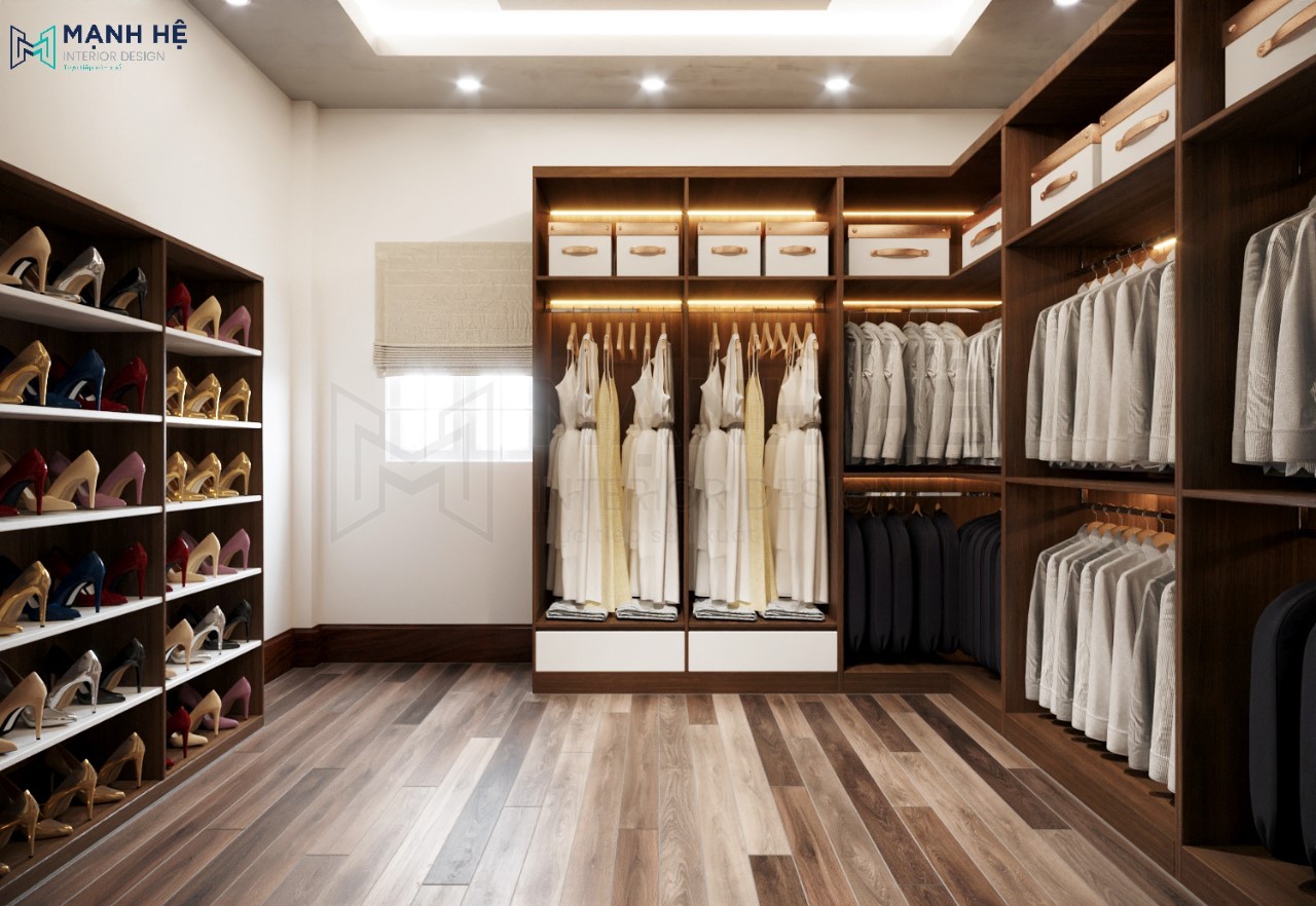 Thiết kế phòng thay đồ riêng với 2 hệ tủ quần áo và giày dép