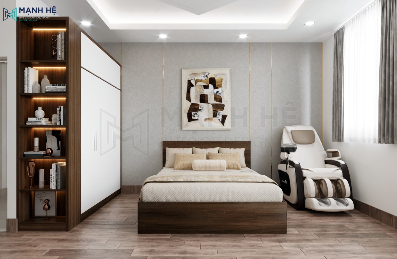 Thiết kế nội thất phòng ngủ đơn giản nhưng vẫn đảm bảo đầy đủ tiện nghi. Bố trí giường ngủ gỗ ở giữa, vách ốp tường phía sau màu xám kết hợp chạy chỉ vàng độc đáo nhằm tạo điểm nhấn cho tổng thể.
