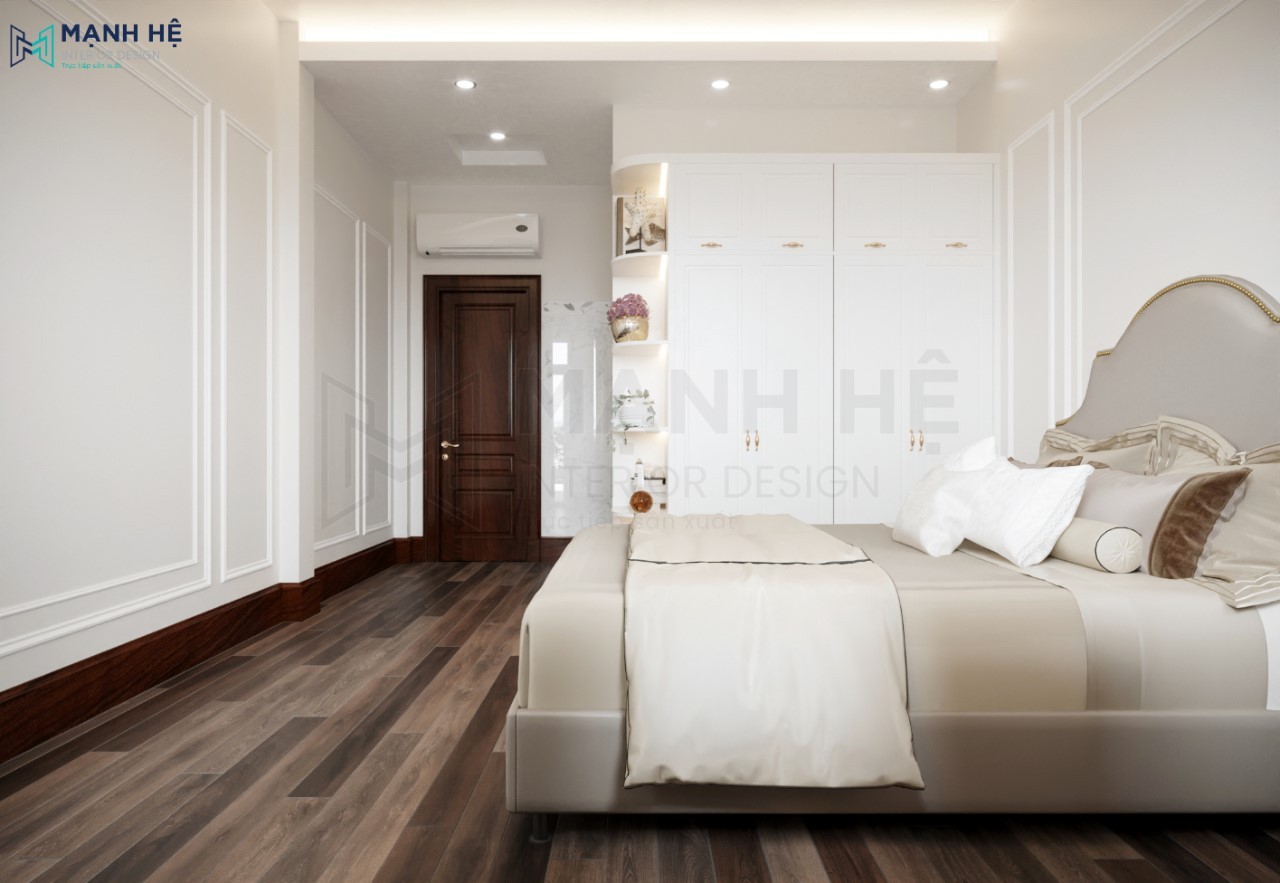 Thiết kế nội thất phòng ngủ master với phong cách tân cố điển hiện đại, đẳng cấp đúng với sở thích của Gia chủ. Bố trí giường ngủ bọc da ở giữa, vách ốp tường phía sau chạy phào chỉ độc đáo tạo điểm nhấn cho tổng thể.