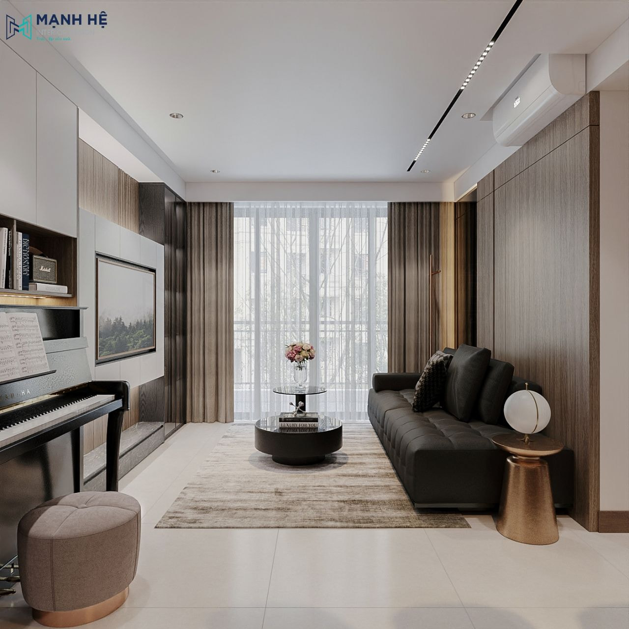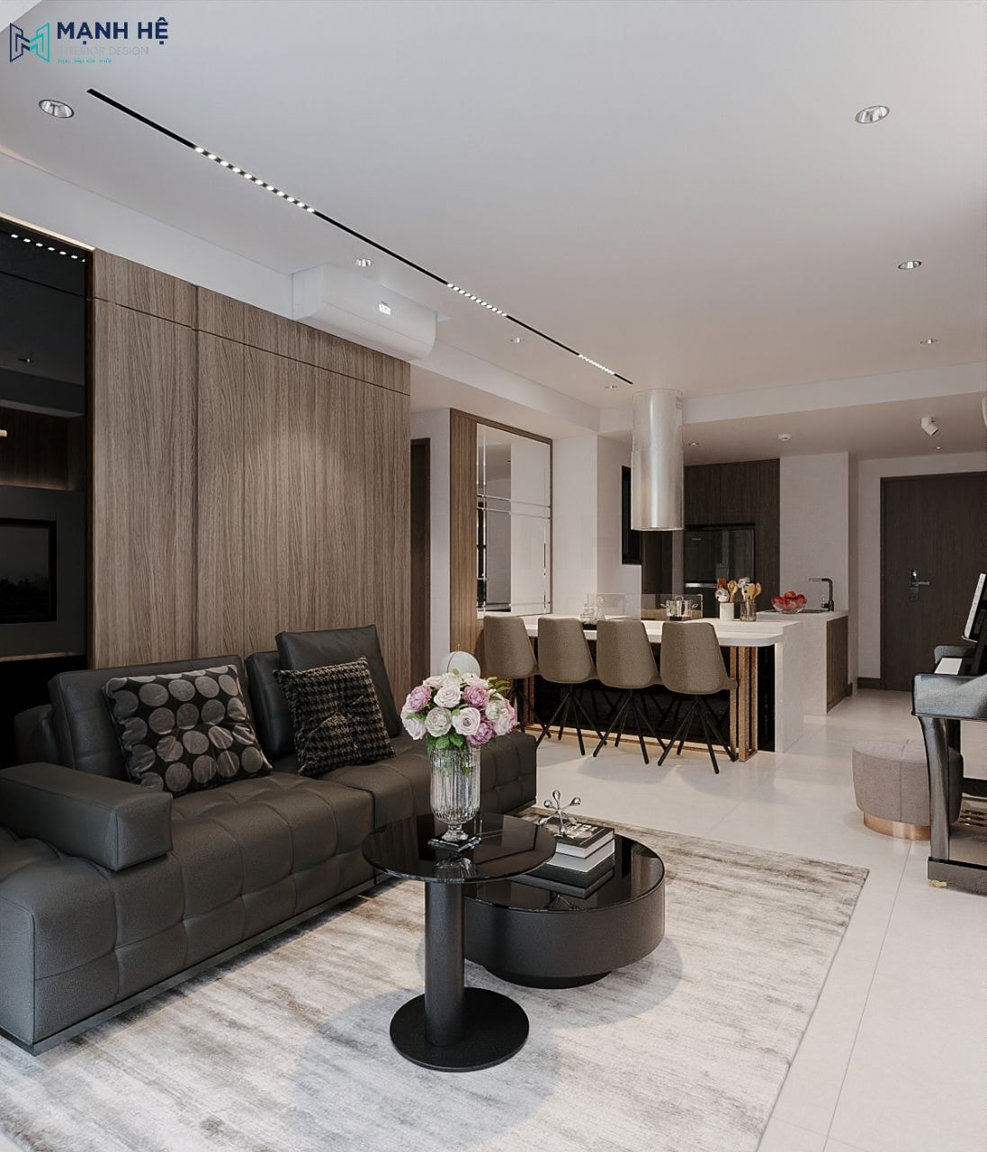 Phong khách căn hộ được ứng dụng toàn bộ cho căn hộ để tạo sự liền mạch và thống nhất cho không gian. Như thông thường, ghế sofa và bàn trà sẽ là tâm điểm của phòng khách. Tủ trang trí, tủ rượu sẽ được tích hợp vào tủ tivi cho tiện – gọn với không gian.