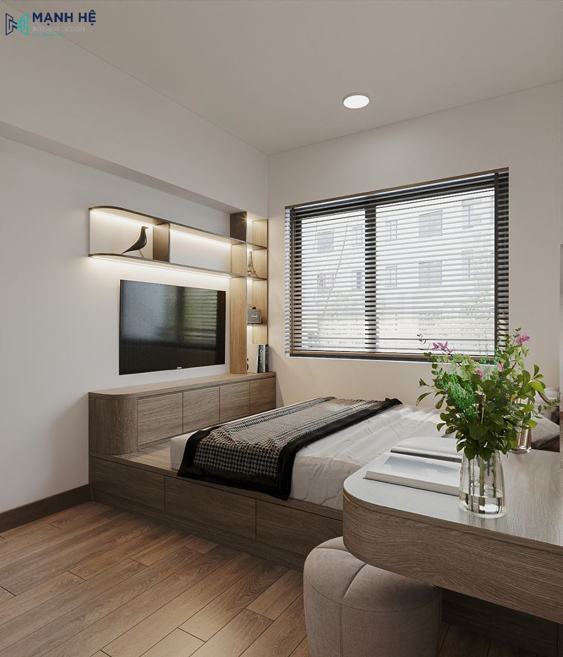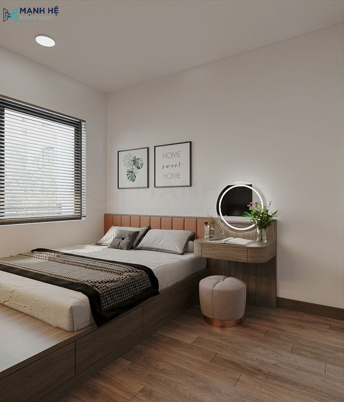 Thiết kế nội thất phòng ngủ chung cư gồm 2 phòng: phòng master cho vợ chồng và phòng ngủ bé. Theo đó, nguyên lý thiết kế nội thất sẽ được chuyên viên thiết kế ứng dụng sao cho hợp lý với thực tế hiện trạng. Ở phòng ngủ master, gia chủ chọn sử dụng thiết kế giường bục tích hợp thêm các món nội thất khác để tối ưu công năng và diện tích.