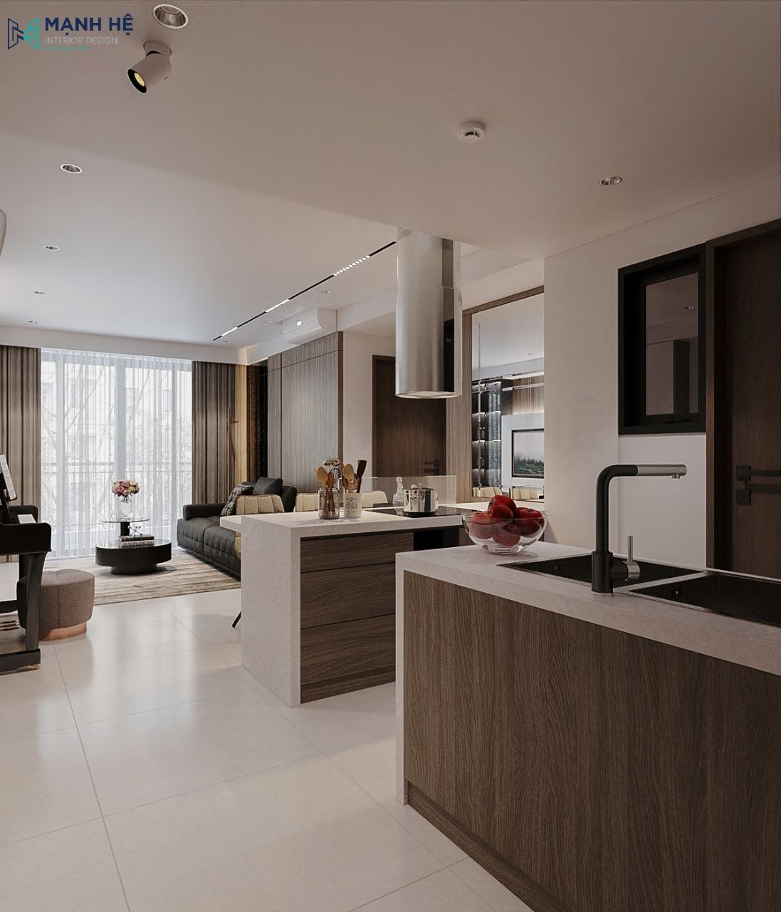 Phòng bếp được đặt liền kề phòng khách giúp tối ưu diện tích căn hộ