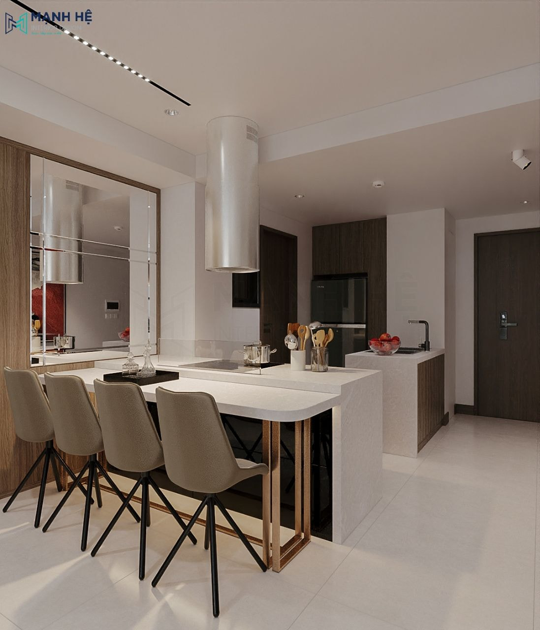 Với thiết kế nội thất phòng bếp cho căn hộ chung cư này, tủ bếp sẽ là tâm điểm của phòng bếp, gia chủ lựa chọn thiết kế thêm bàn đảo để làm nơi sửa soạn đồ ăn cho rộng rãi, đồng thời bàn ăn cũng nối liền bàn đảo bếp. Thêm kính thủy ốp tường để tạo chiều sâu không gian. Toàn bộ nội thất phòng bếp được ưu tiên sử dụng lõi MDF kháng ẩm để chống mối mọt và đảm bảo độ bền cao.
