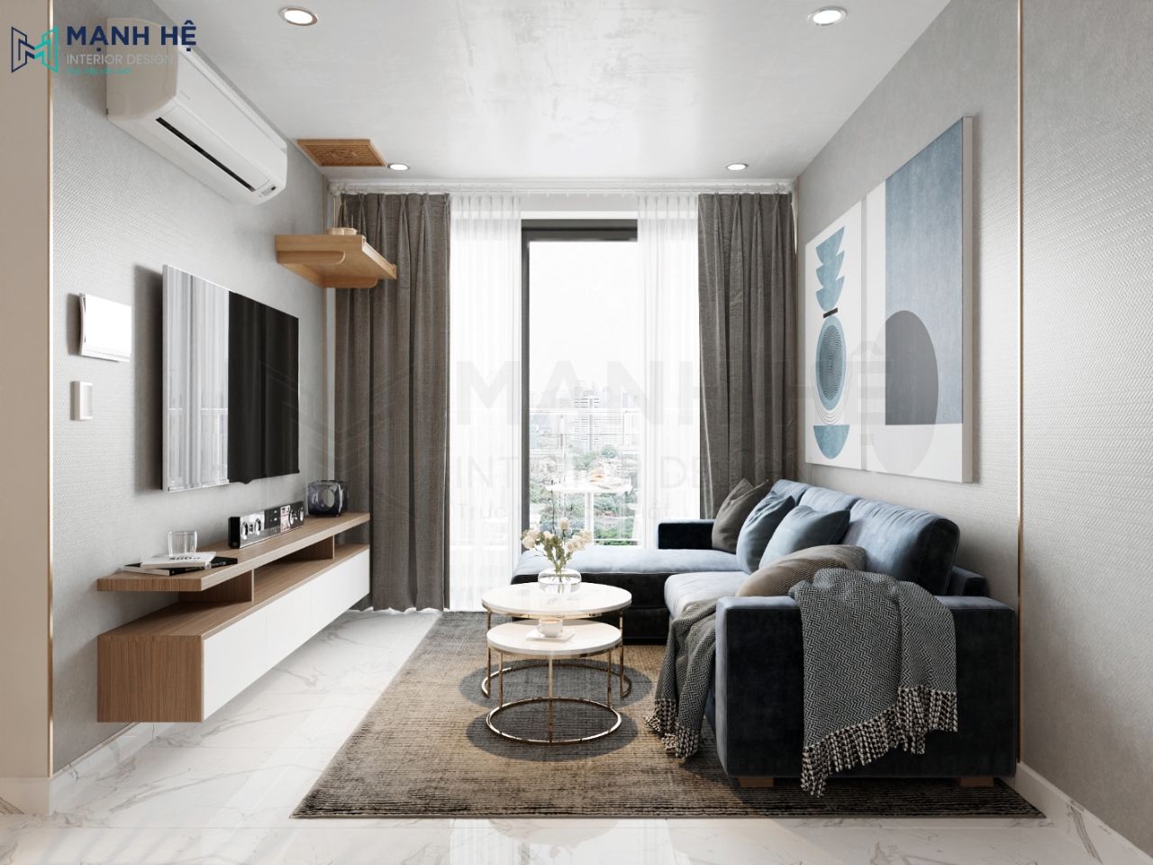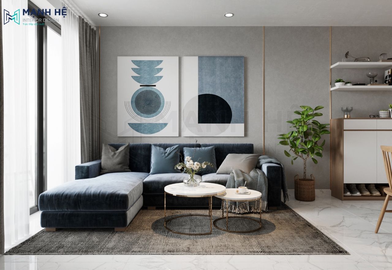 Hôm nay Mạnh Hệ xin giới thiệu mẫu thiết kế độc đáo có sự kết hợp giữa gam màu nóng – lạnh trung tính theo sở thích của chị Trang. Gia đình chị lựa chọn bộ sofa kết hợp tranh treo tường với gam màu xanh đậm nhạt xem kẽ là một nét chấm phá, ấn tượng so với tổng thể của phòng khách. Thiết kế nội thất phòng khách với gam màu xanh dương trung tính mang lại cảm giác tươi mát, dịu nhẹ cho bất kì ai bước vào căn phòng.