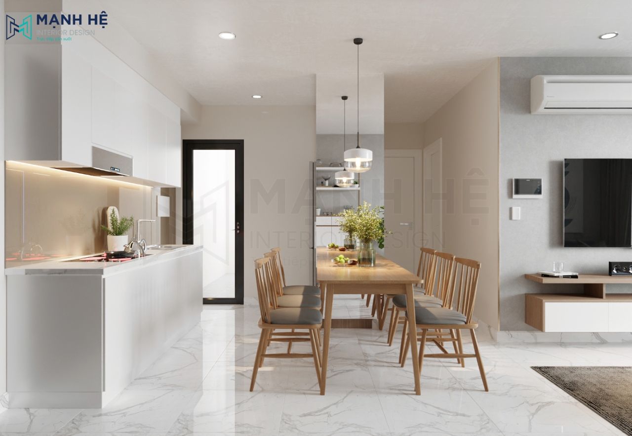 Gia chủ rất thông minh khi lựa chọn thiết kế phòng bếp liền phòng khách cho căn hộ 70m2 của mình. Với lối thiết kế này, Gia chủ sẽ đảm bảo được tiêu chí tối ưu diện tích sử dụng. Bên cạnh đó, Gia chủ lựa chọn màu sắc đồng nhất đảm bảo sự liên kết giữa hai không gian.