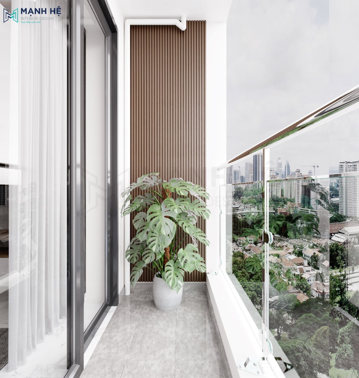 Lối ra ban công được trang trí thêm cây xanh như là một góc thư giãn nhỏ, giúp bạn xua tan đi mệt mỏi sau một ngày làm việc căng thẳng hay cầm một tách trà ra đây nhâm nhi đón nắng ban mai.
