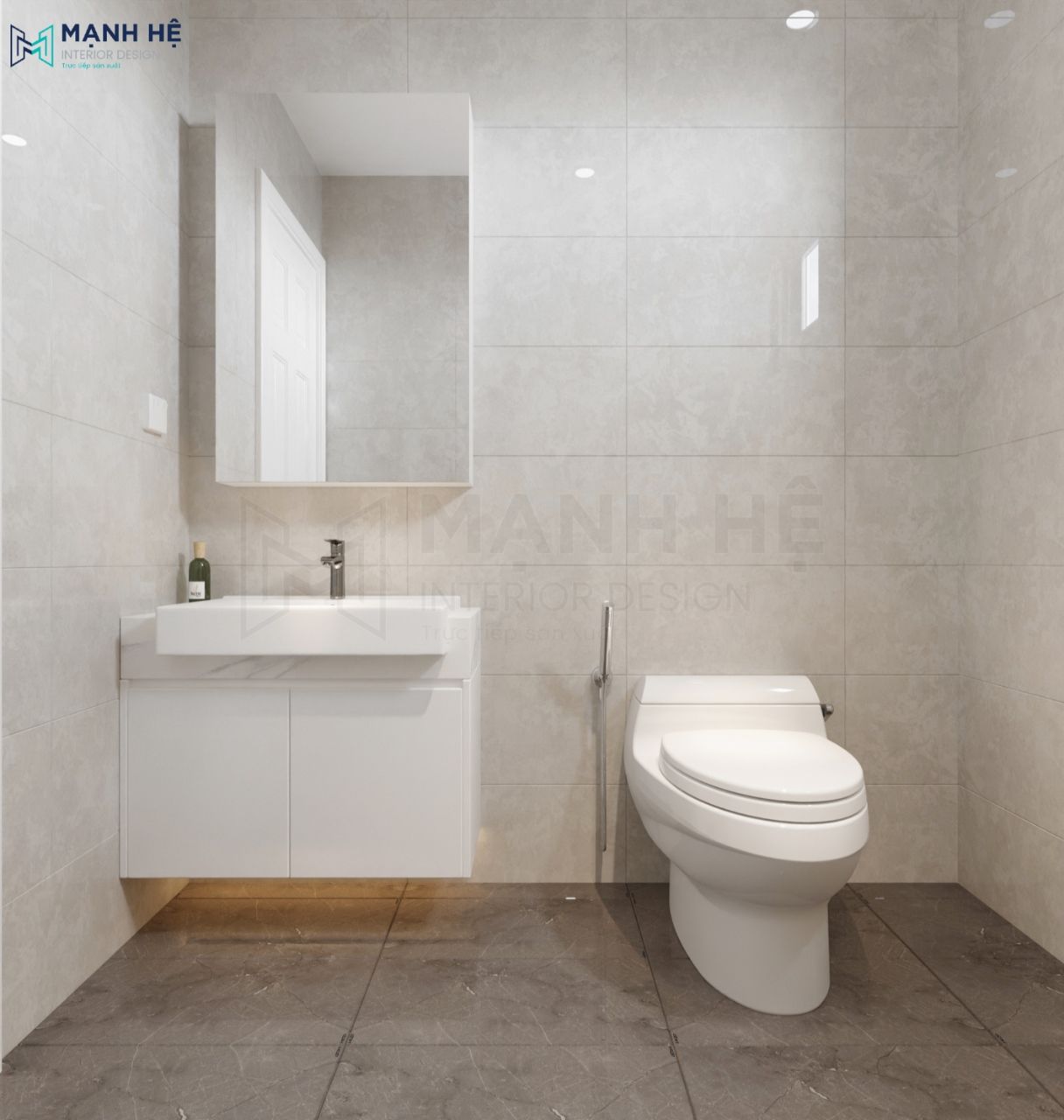 Nhà vệ sinh được ốp đá sáng bóng tạo cảm giác sạch sẽ