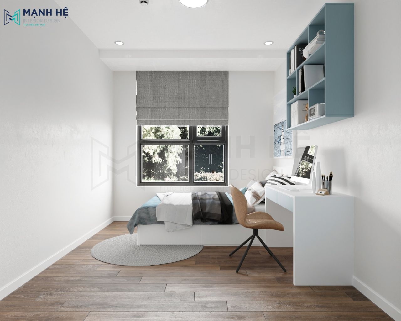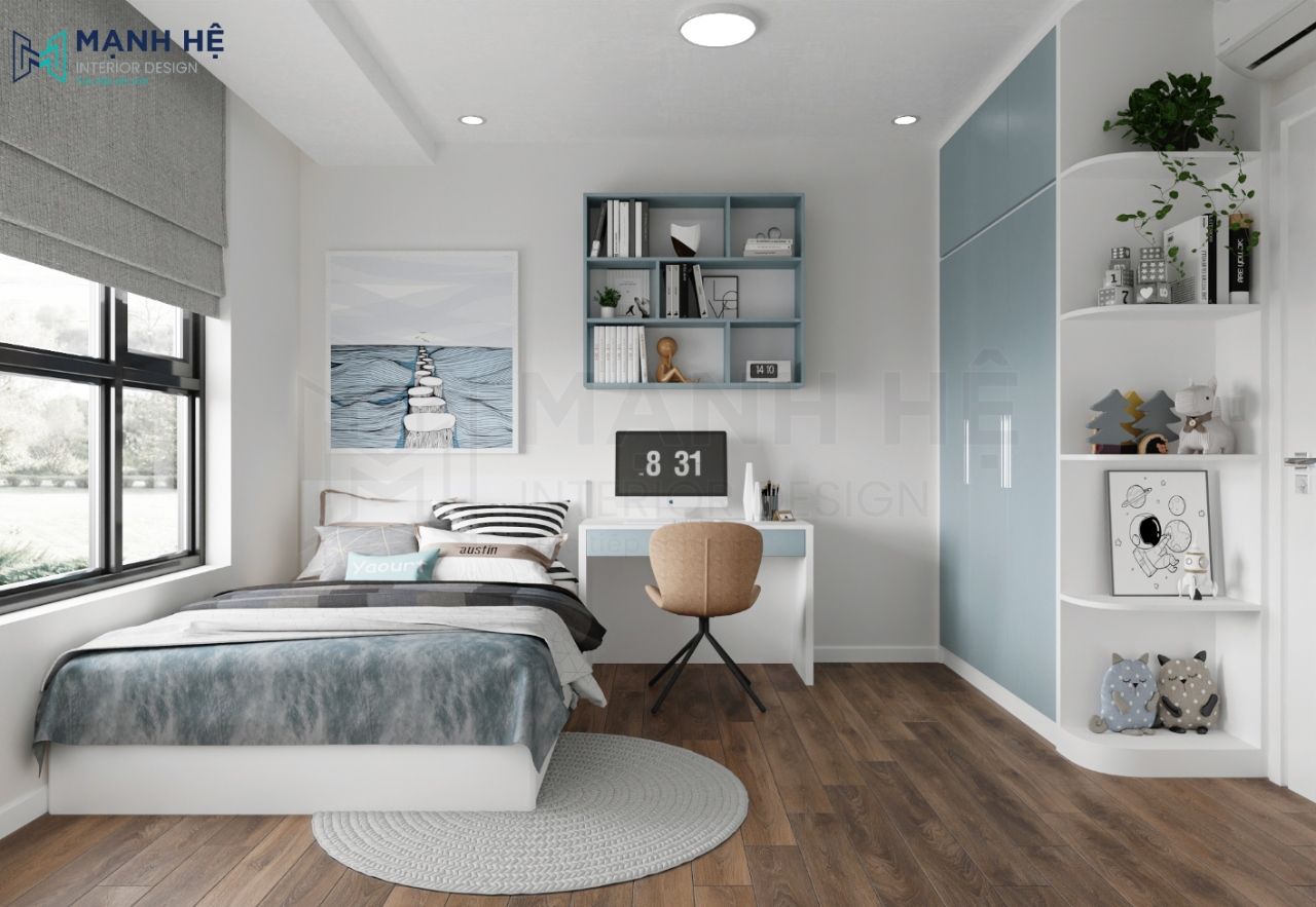 Gia chủ có một tình cảm đặc biệt thiết kế phòng ngủ màu xanh nên đã lựa chọn màu xanh làm gam màu chủ đạo .