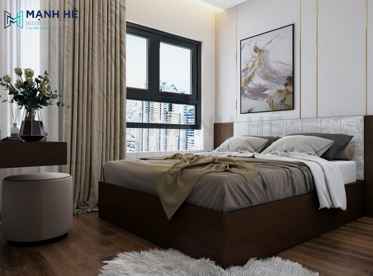 Thiết kế nội thất phòng ngủ master với màu nâu gỗ trầm là gam màu chủ đạo mang đến cảm giác ấm áp. Bố trí giường ngủ lớn sát tường làm cho phòng ngủ gọn gàng hơn. Sử dụng rèm cửa 2 lớp giúp tối ưu ánh sáng trong phòng.