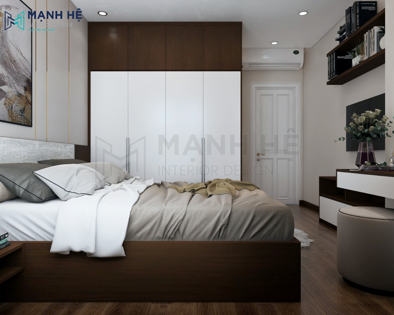 Không gian phòng ngủ master sử dụng gam màu gỗ nâu tối màu ấm áp