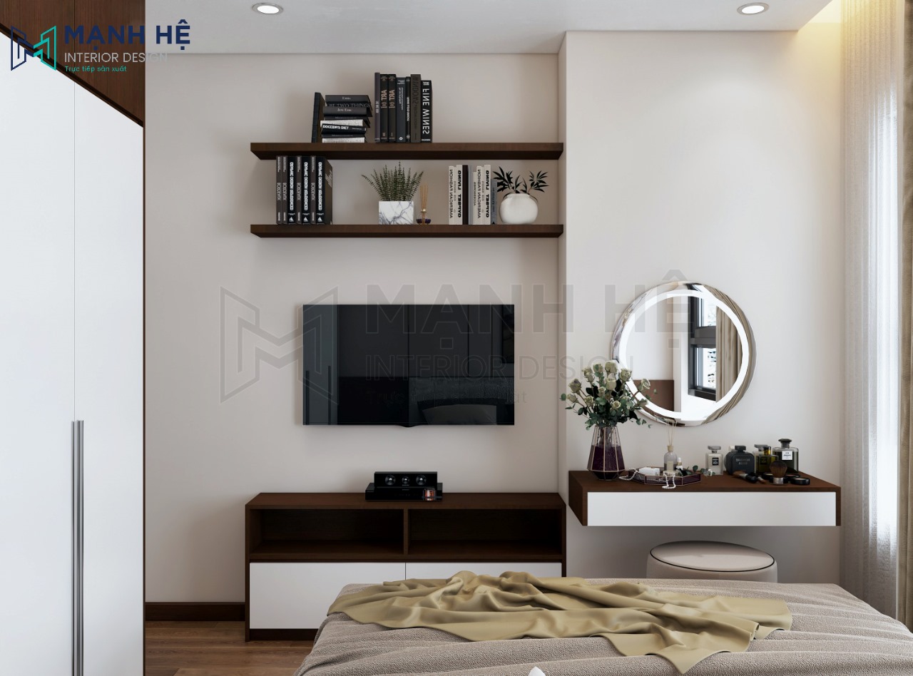 Bàn trang điểm và hệ tủ tivi với thiết kế đồng bộ màu sắc và chất liệu