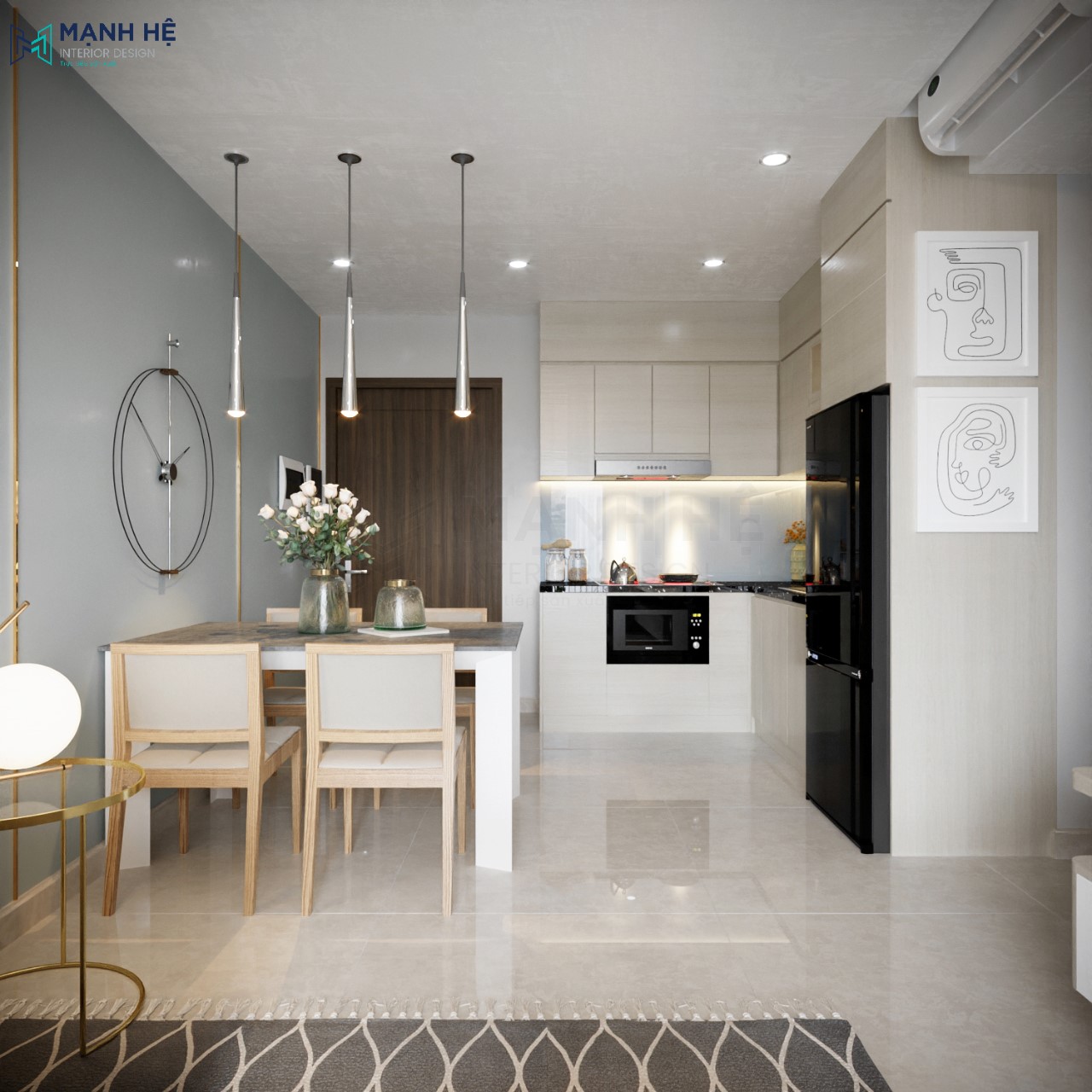 Thiết kế bộ bàn ăn ở giữa không gian phòng khách và bếp như một cách để tối ưu diện tích căn hộ. Chất liệu bộ bàn ăn từ gỗ tự nhiên chắc chắn với vân gỗ cực sắc sảo. Thêm đèn trần thả lý tưởng.