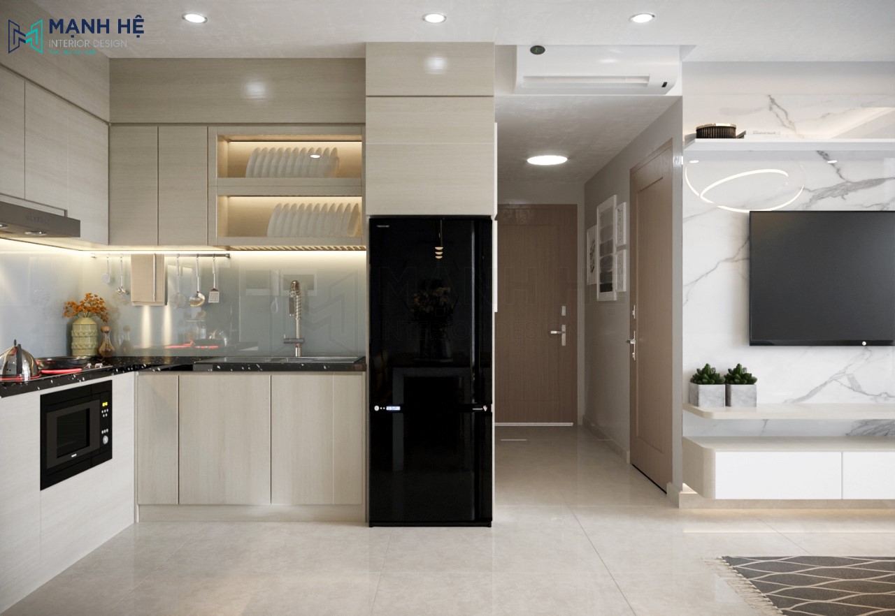 Thiết kế nội thất phòng bếp với hệ tủ bếp chữ L làm từ gỗ công nghiệp có ngăn chứa tủ lạnh