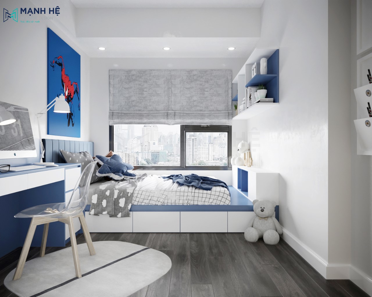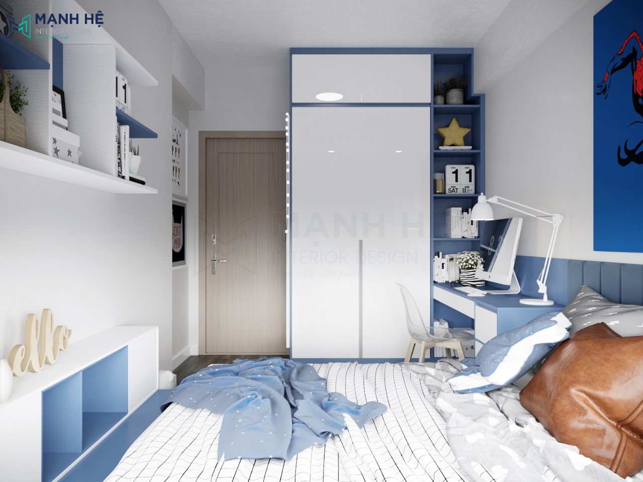 Tủ quần áo cao đụng trần với hai màu xanh dương và màu trắng xen kẽ, tận dụng các ngăn hộc đựng đồ trang trí. Tích hợp thêm bàn làm việc cho bé. Cuối giường thiết kế kệ sách cho căn phòng thêm tiện nghi.
