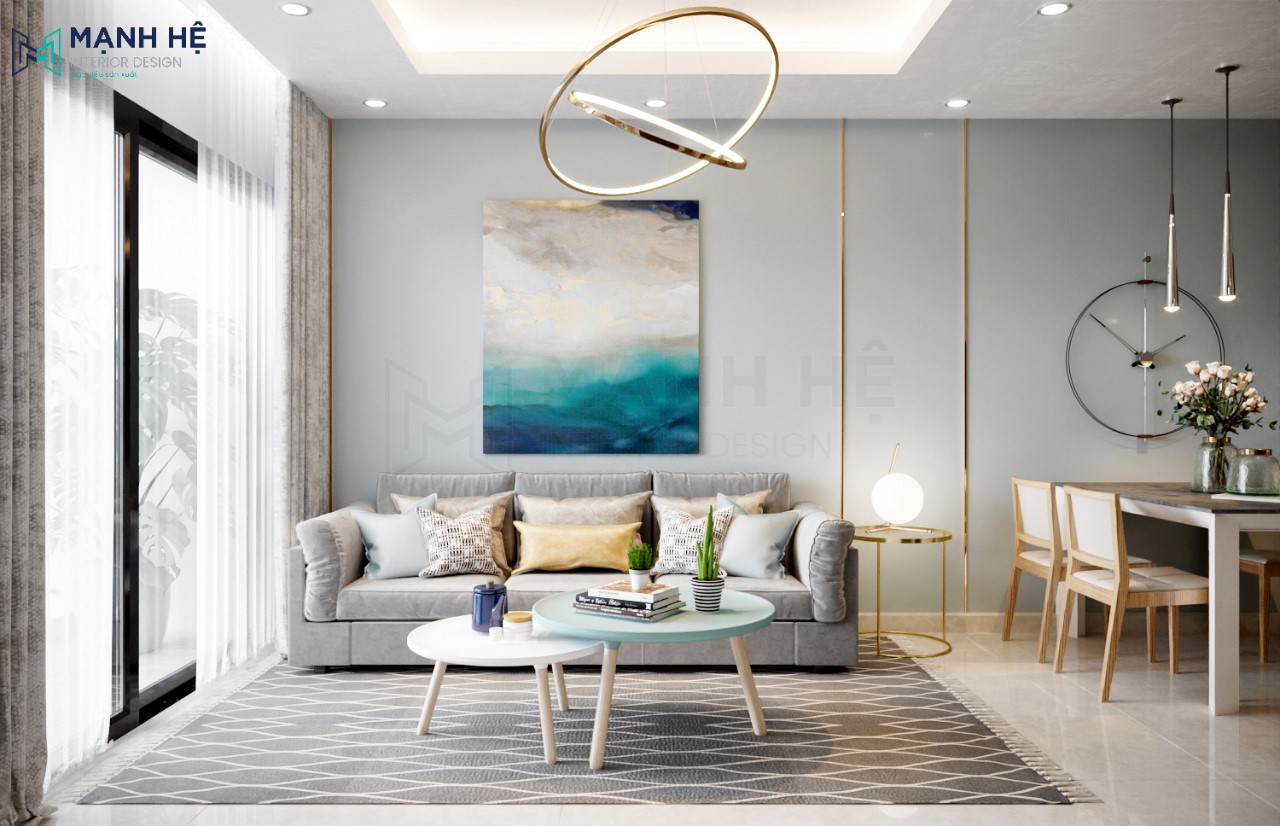 Thiết kế phòng khách phong cách hiện đại với gam màu trung tính nhẹ nhàng, tạo cảm giác thư giãn cho gia chủ. Với những đường nét thiết kế nội thất và màu sắc hài hòa chắc chắn không gian này sẽ xứng đáng là không gian tuyệt vời nhất cho căn hộ.