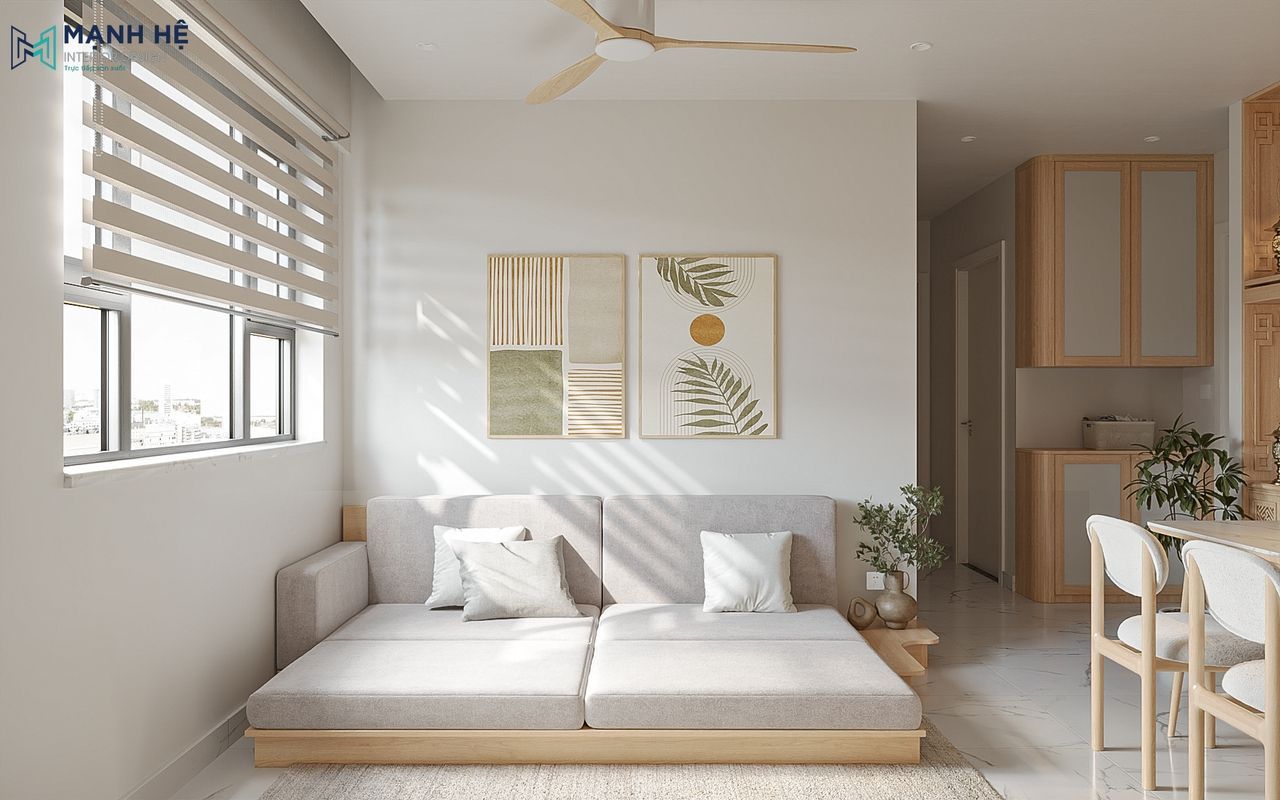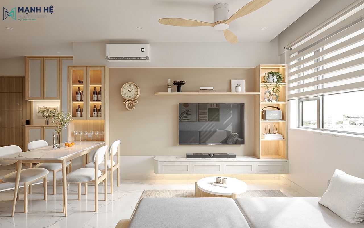 Với mong muốn kiến tạo không gian sống đồng bộ và nhẹ nhàng cho gia đình trẻ, anh T đã lựa chọn phong cách Japandi làm cảm hứng chủ đạo kết hợp nội thất hiện đại cho căn hộ 76m2 tại Saigon Homes. Toàn bộ nội thất được Mạnh Hệ thiết kế thống nhất từ chất liệu gỗ, tạo nên tổng thể ấm áp, tinh tế mà vẫn đảm bảo công năng hiện đại – từ sofa gấp thành giường, giường tầng đến giường đôi cho bé. Cùng khám phá hành trình Mạnh Hệ biến căn hộ 76m2 này thành tổ ấm Japandi hiện đại đầy cảm xúc nhé!
