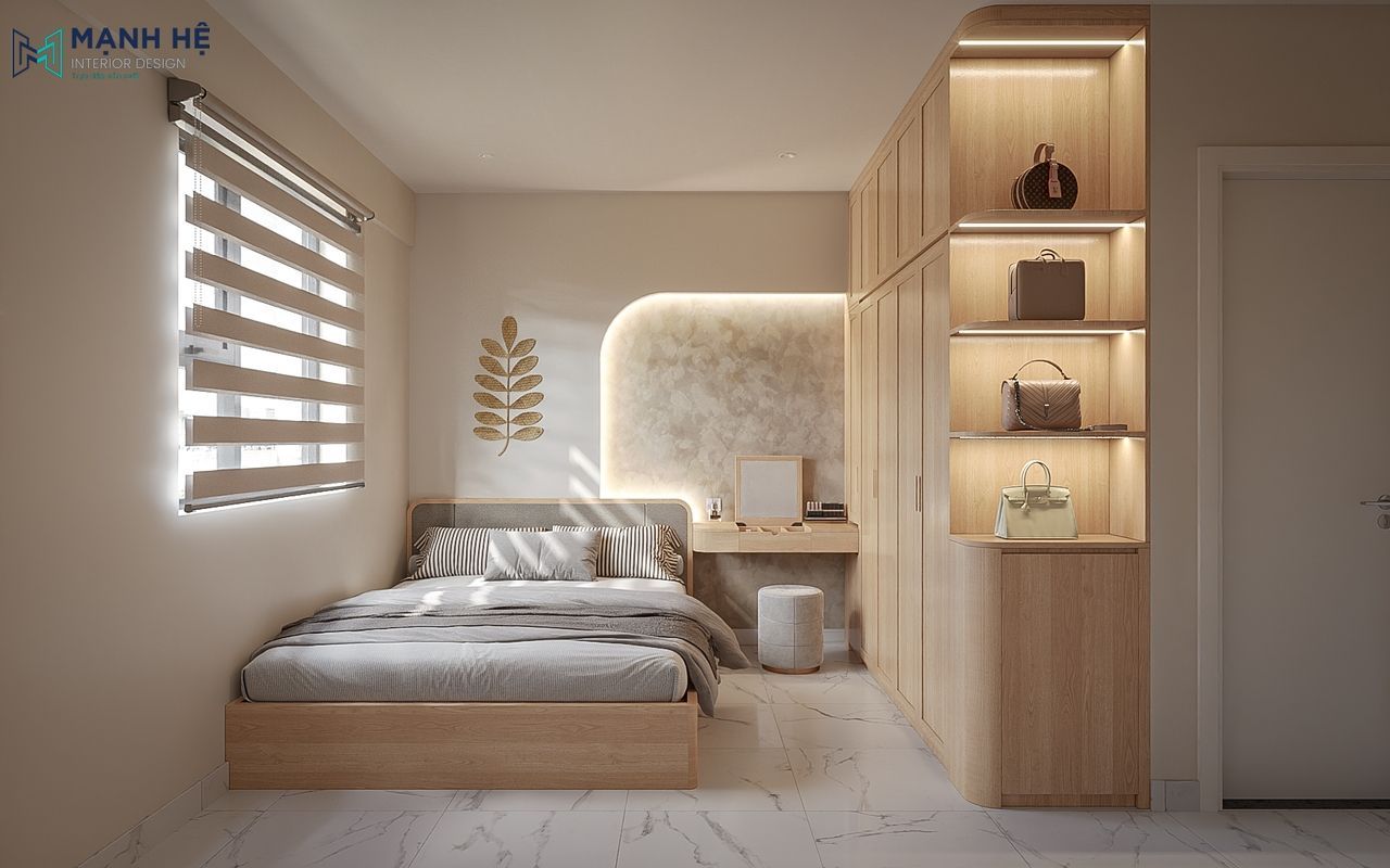 Toàn bộ nội thất phòng ngủ master sử dụng tone be – gỗ sáng chủ đạo, kết hợp ánh sáng tự nhiên dịu nhẹ, giúp căn phòng luôn thông thoáng và gần gũi. Hệ tủ quần áo kịch trần bo cong mềm mại được xử lý khéo léo cùng dải đèn LED hắt sáng, vừa mở rộng không gian vừa tạo điểm nhấn sang trọng. Bàn trang điểm nhỏ gọn được bố trí liền tường, nối tiếp với mảng tường sơn hiệu ứng nhẹ nhàng phía đầu giường, tạo nên tổng thể hài hòa giữa thẩm mỹ và công năng.