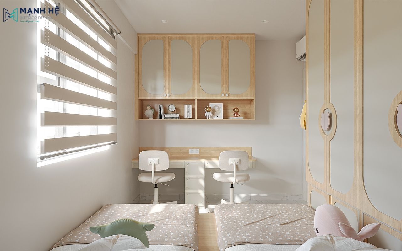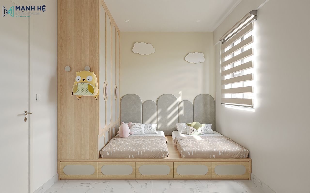 Không gian phòng ngủ bé gái được thiết kế với tinh thần tươi sáng, đúng chất “tổ ấm nhỏ” trong căn hộ hiện đại. Mạnh Hệ lựa chọn tone màu pastel kết hợp gỗ sáng để mang đến cảm giác nhẹ nhàng. Hệ giường đôi thấp được bố trí liền mạch, giúp bé có không gian nghỉ ngơi thoải mái và an toàn. Để tạo điểm nhấn trong phòng, vách đầu giường bọc nệm uốn cong mềm mại cùng chi tiết đám mây tạo nên nét ngọt ngào và sinh động.