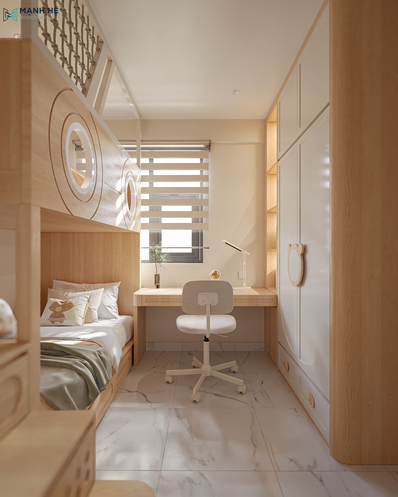 Khác với phòng của bé gái, bé trai thường cần một không gian riêng tư và năng động hơn. Vì thế, Mạnh Hệ chọn giải pháp giường tầng thông minh để vừa giữ sự gọn gàng và thoáng đãng cho căn phòng. Hệ giường tầng gỗ công nghiệp được thiết kế chắc chắn với các góc bo tròn an toàn, đặc biệt là cầu thang tích hợp ngăn kéo tiện lợi. Bên dưới là bàn học được bố trí để đón ánh sáng tự nhiên, mang đến không gian học tập thoải mái và tràn đầy năng lượng cho bé mỗi ngày.