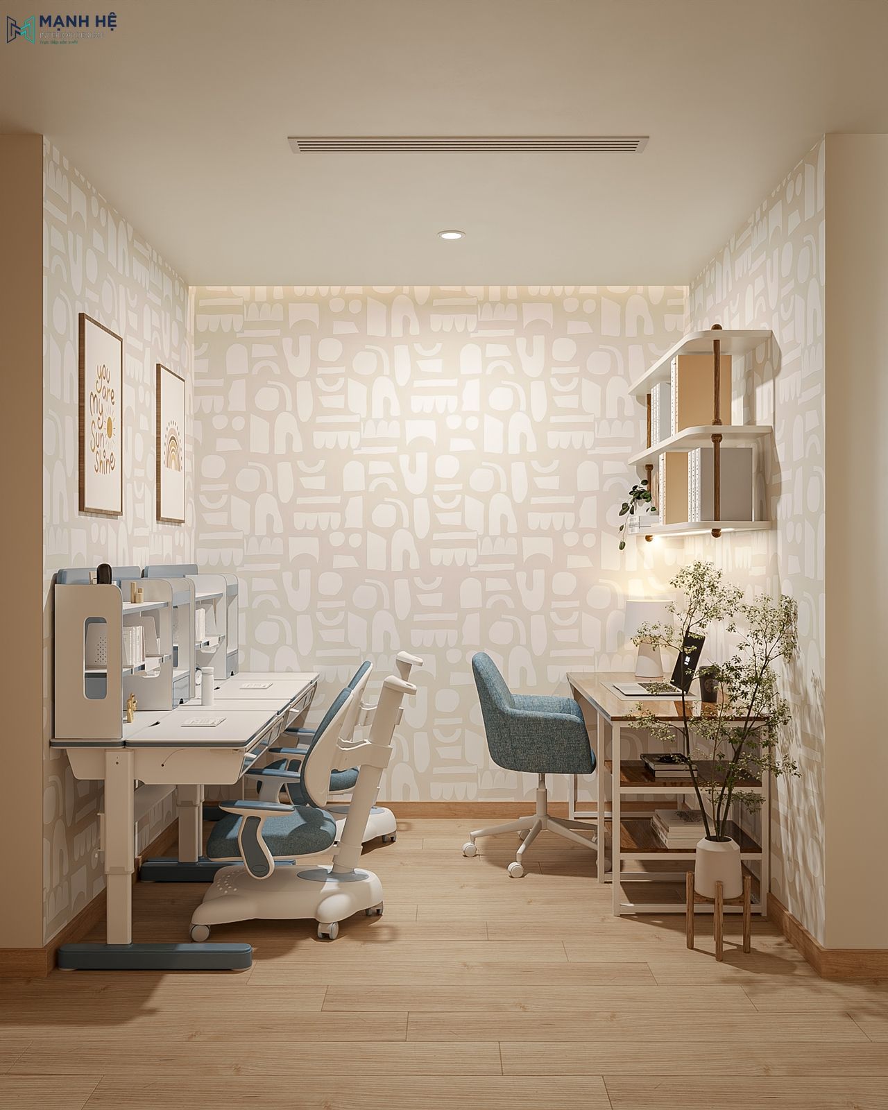 Dù diện tích hạn chế, không gian làm việc và góc học tập của gia đình anh D vẫn được Mạnh Hệ bố trí thông minh với bàn học đôi của các con được đặt song song với bàn làm việc của bố mẹ, giúp tối ưu diện tích mà vẫn giữ được sự riêng tư cho từng người. Ngoài ra, hệ kệ treo tường và tủ mở trên cao được thiết kế để tăng không gian lưu trữ mà không chiếm diện tích sàn, kết hợp gam màu sáng nhẹ mang lại cảm giác tập trung và thoáng đãng hơn cho toàn bộ khu vực.