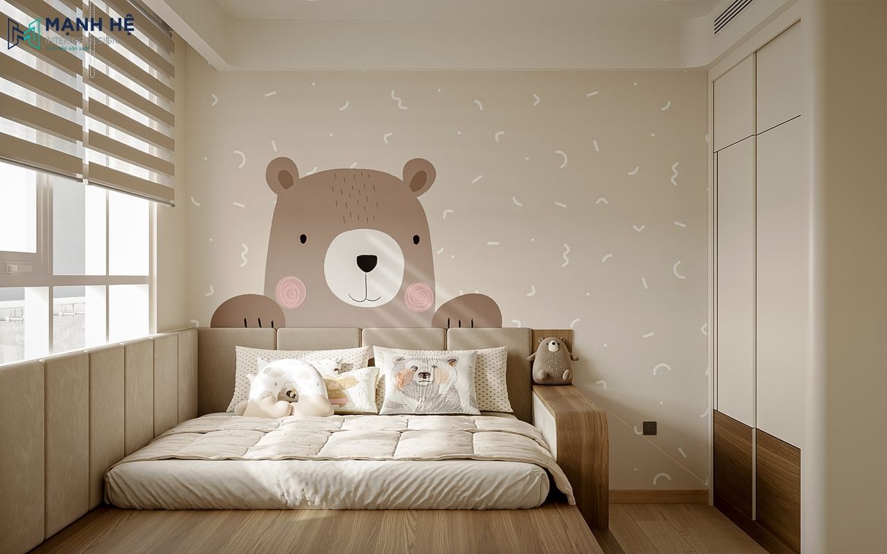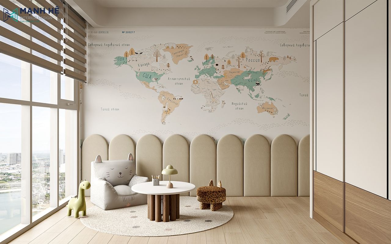 Phòng sinh hoạt của con được Mạnh Hệ thiết kế như một “góc thế giới thu nhỏ”, nơi bé có thể vui chơi và học hỏi trong không gian an toàn, sinh động. Mảng tường bản đồ thế giới kết hợp đường bo cong bọc nệm êm ái cùng gam màu be – nâu nhạt hài hòa ánh sáng tự nhiên. Bộ bàn ghế mini giữa phòng trở thành điểm gắn kết, nơi con thoải mái đọc sách, vẽ tranh và cùng bố mẹ chia sẻ những phút giây vui đùa.