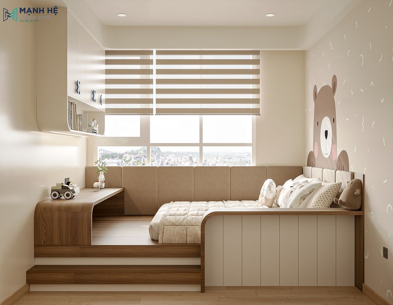 Dù diện tích không lớn, phòng ngủ của bé vẫn trở nên ấn tượng nhờ cách bố trí thông minh và sáng tạo mà Mạnh Hệ cùng anh D đã thống nhất trong quá trình thiết kế. Thay vì sử dụng giường truyền thống, không gian được nâng sàn nhẹ để tích hợp giường ngủ liền bàn đọc sách, vừa tiết kiệm diện tích vừa tạo ranh giới tinh tế giữa các khu vực chức năng. Các góc bo cong mềm mại cùng gam màu be sáng kết hợp gỗ ấm mang lại cảm giác thân thiện, giúp bé thoải mái vận động trong chính không gian của mình.