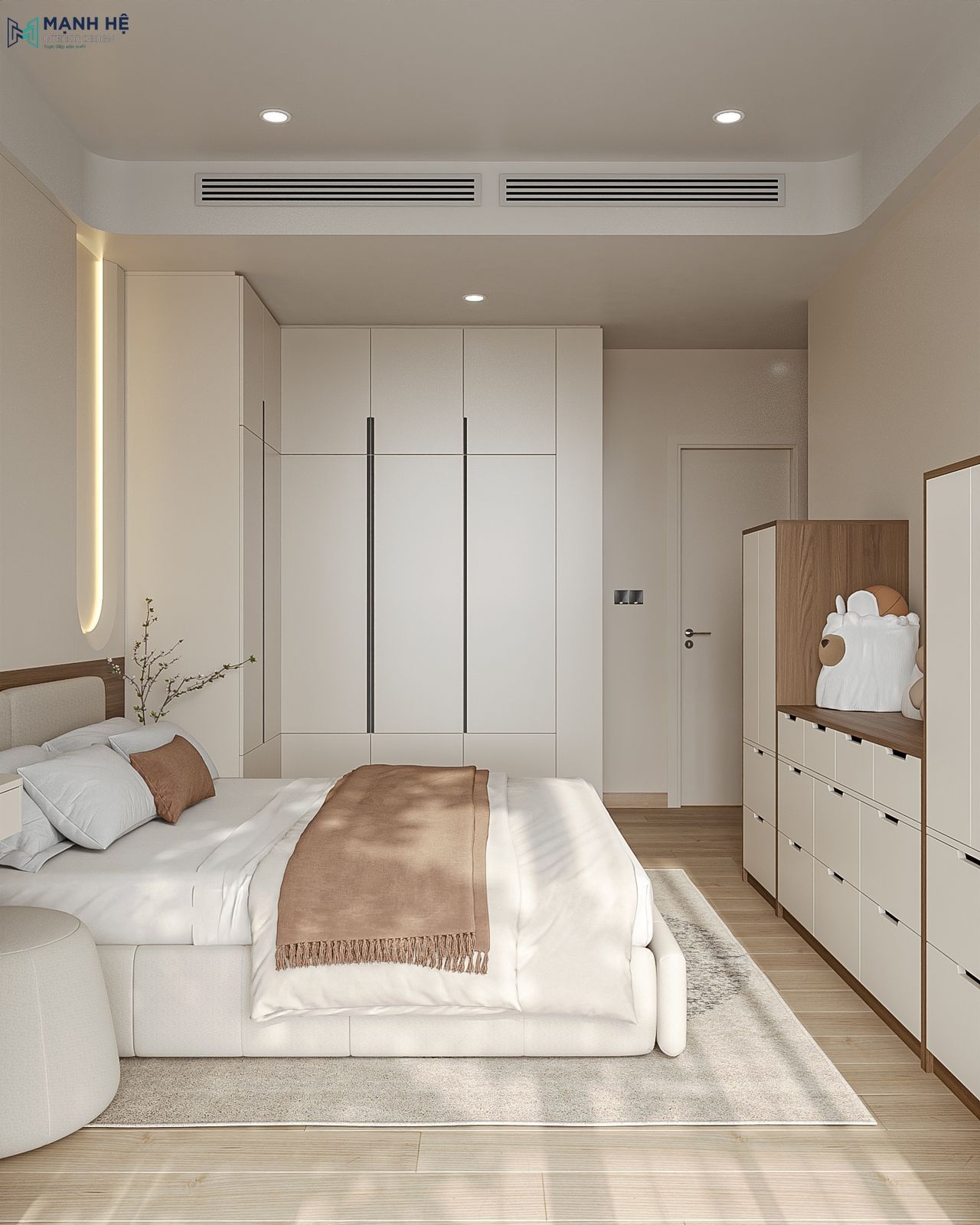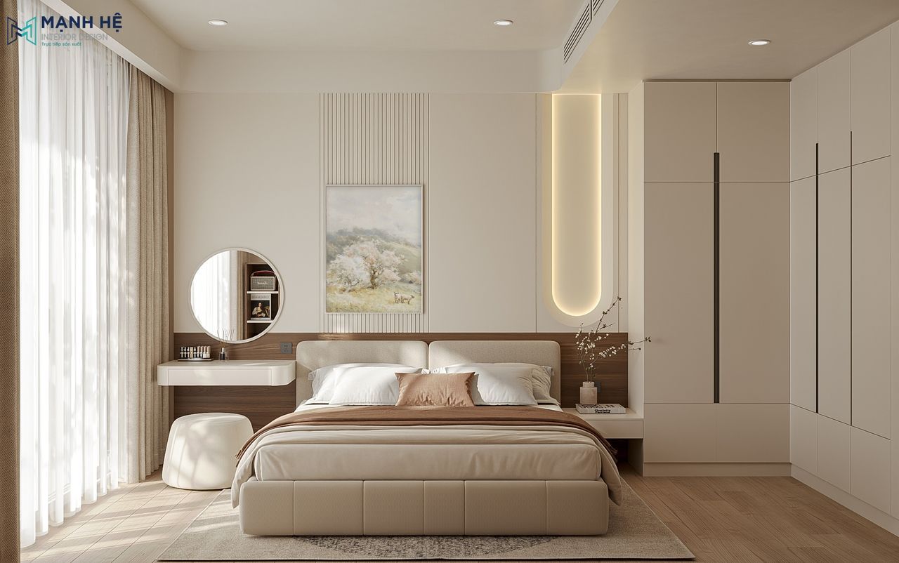 Phòng ngủ của vợ chồng anh D được thiết kế với giường ngủ đặt ở vị trí trung tâm, liền kề bàn trang điểm bo cong và hệ tủ quần áo kịch trần. Kết hợp mảng tường đầu giường được tạo điểm nhấn với lam đứng kết hợp ánh sáng hắt uốn cong dịu nhẹ làm nổi bật nét tinh tế, tạo chiều sâu cho căn phòng mà không cần nhiều chi tiết trang trí. Đặc biệt, Mạnh Hệ tận dụng khéo léo các góc trống để bố trí thêm tủ lưu trữ thấp và kệ trang trí, giúp căn phòng vừa tiện nghi vừa duy trì sự thoáng đãng.