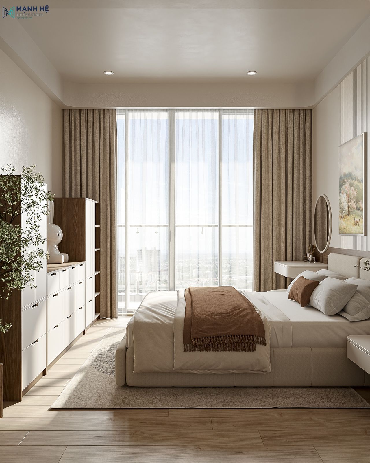 Theo nhu cầu của gia chủ, các phòng ngủ chung cư đều được thiết kế hướng đến sự thư giãn và ấm cúng, sử dụng gam màu be – nâu nhạt đồng bộ kết hợp chất liệu gỗ mộc mạc tạo cảm giác cân bằng, an yên.