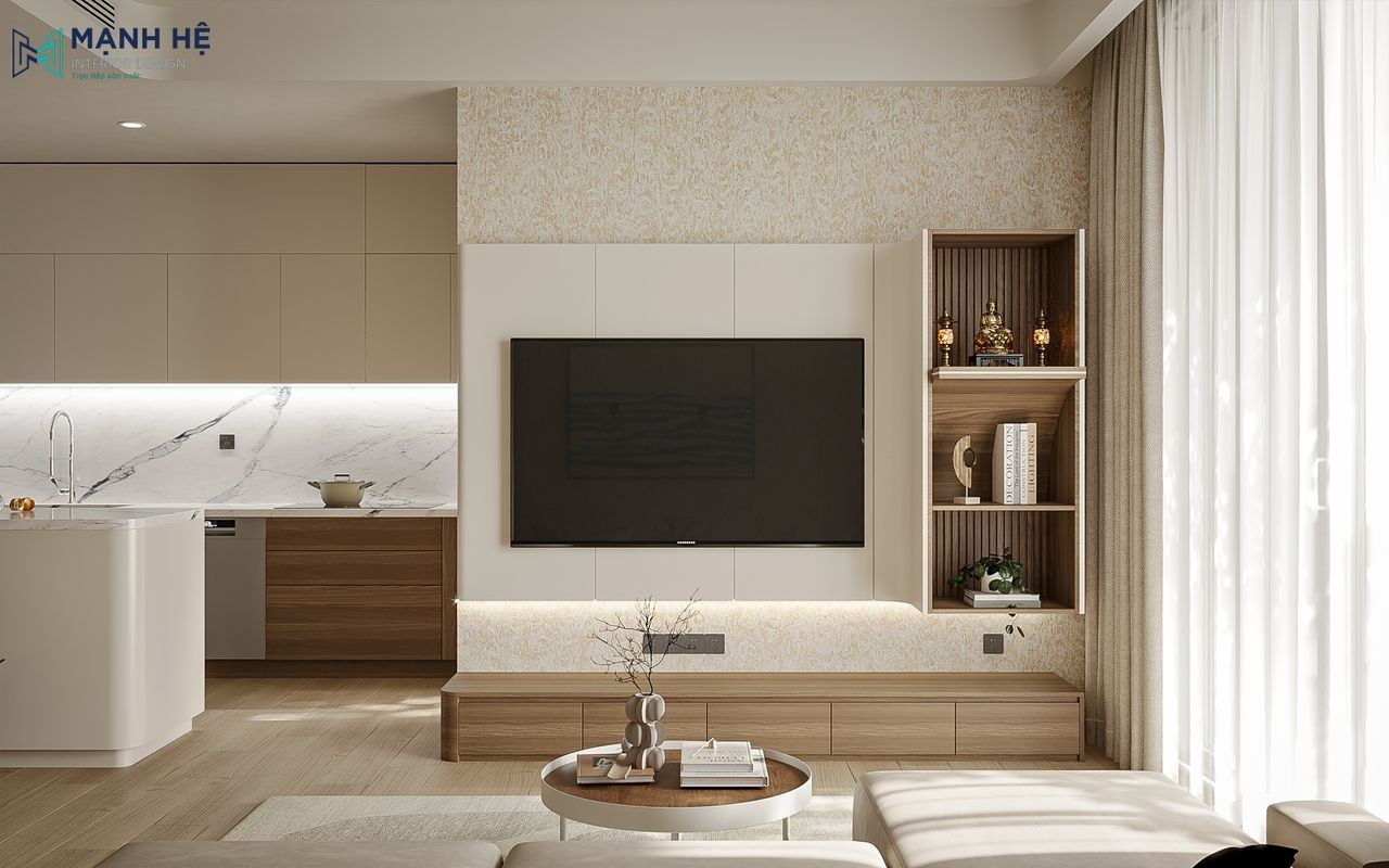 Phòng khách chung cư của anh D được thiết kế dựa trên tiêu chí mở rộng không gian và tối ưu ánh sáng tự nhiên – yếu tố mà gia chủ đặc biệt chú trọng. Kiến trúc sư Mạnh Hệ đã lựa chọn bố trí sofa sát tường với gam màu be đồng bộ, giúp ranh giới giữa các khối nội thất và tường được làm mờ, từ đó mang đến cảm giác thoáng rộng và liền mạch hơn cho tổng thể. Điểm nhấn trong không gian này là khu vực kệ tivi được thiết kế tinh tế với phần ốp gỗ kết hợp vách bo cong và mảng tường sơn hiệu ứng mềm mại, tạo nên cảm giác liền mạch giữa phòng khách và bếp.