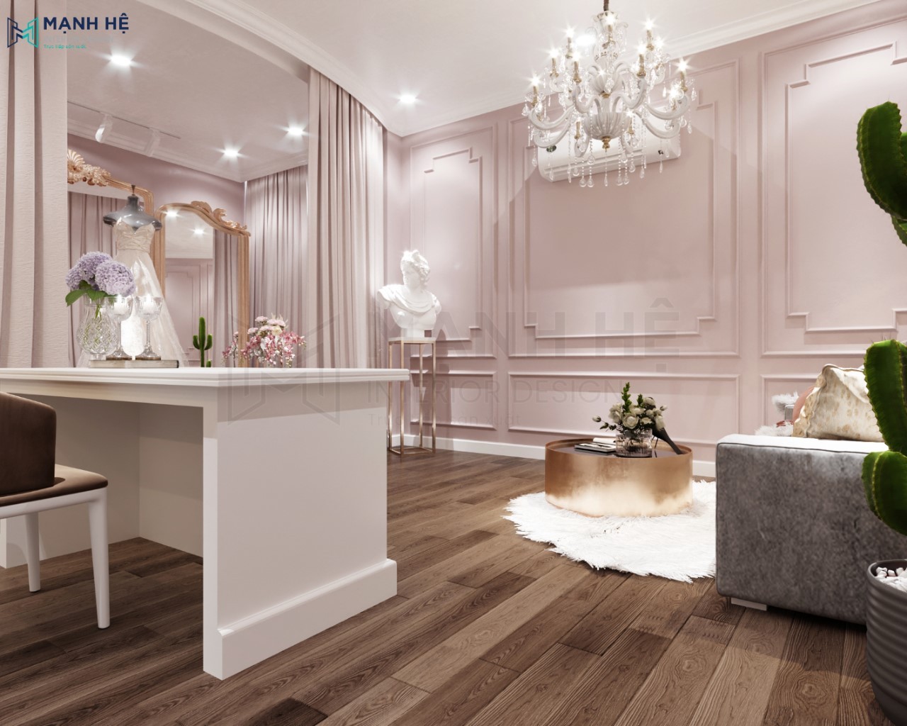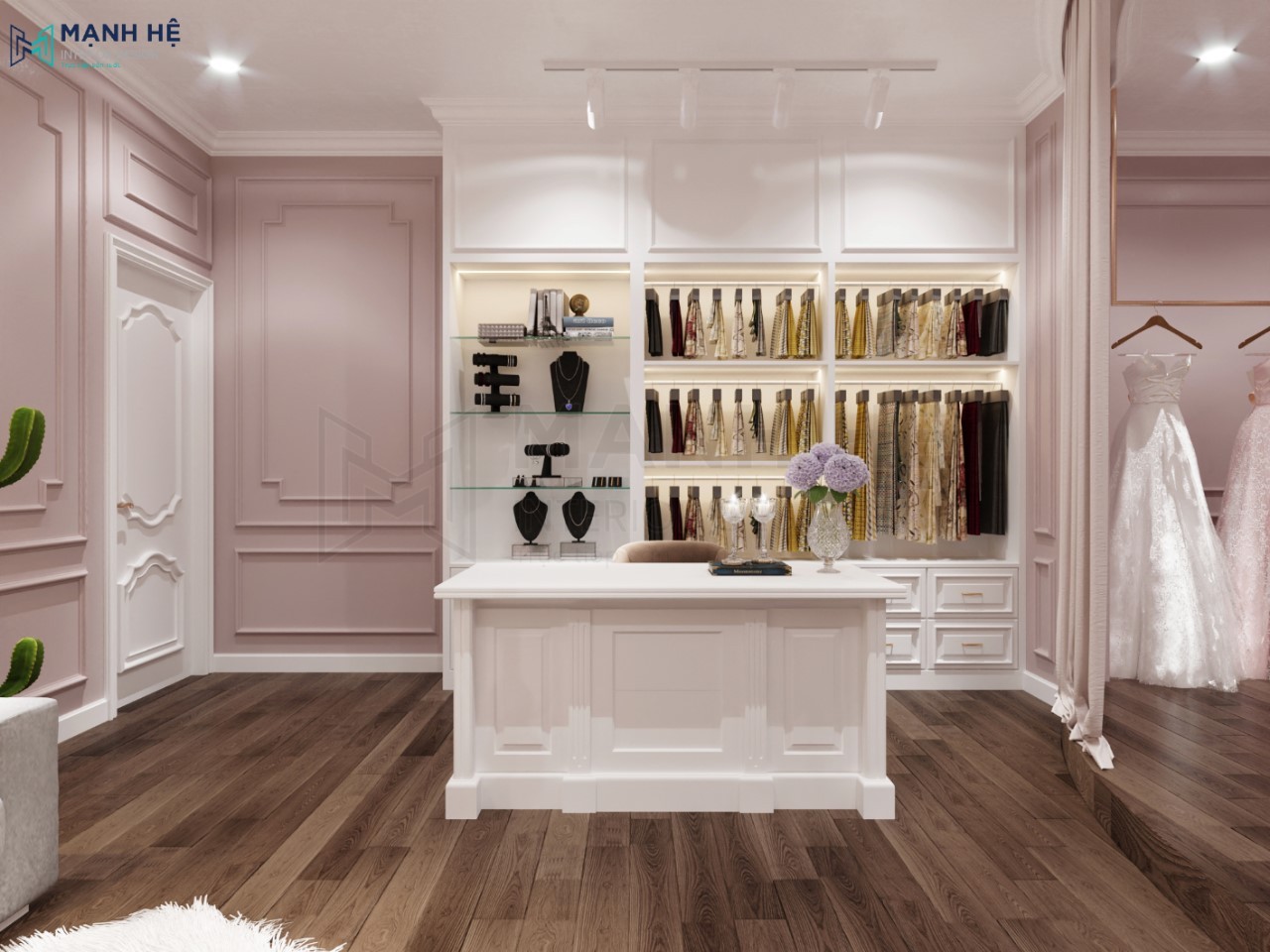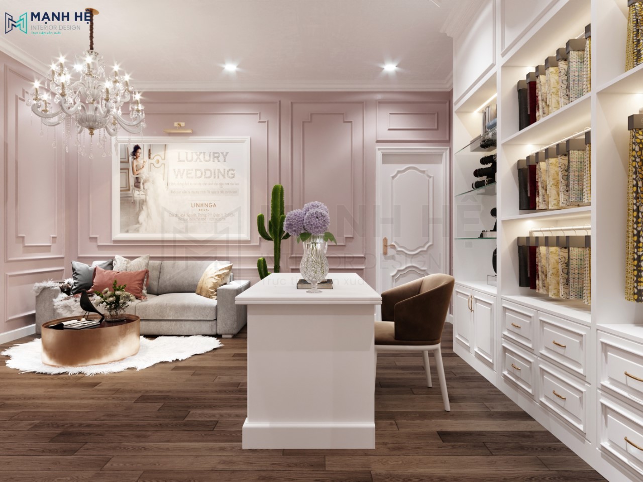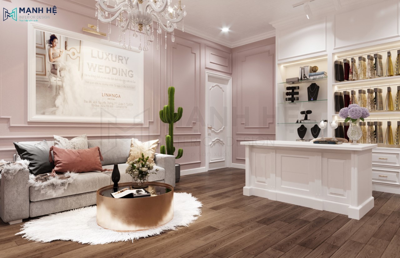Showroom váy cưới luôn là không gian được các chủ doanh nghiệp đầu tư chú trọng nhất trong thiết kế nội thất. Bởi vì nơi đây là địa điểm chỉ dành cho những khách hàng sử dụng duy nhất một lần và được họ lựa chọn kỹ lưỡng nhất. Do đó, Nội thất Mạnh Hệ đã rất tự hào khi được Váy cưới Linh Nga lựa chọn làm đơn vị thiết kế showroom áo cưới cho dự án này. Các bạn cùng đón xem thêm nhiều hình ảnh dưới đây nhé!