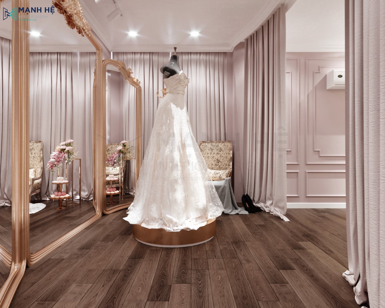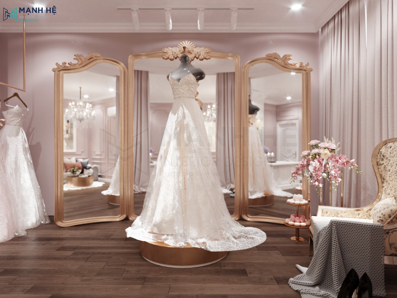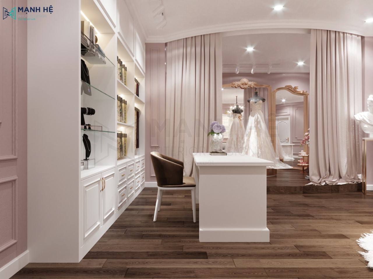 Thiết kế không gian trưng bày váy cưới lung linh sang trọng, đúng tinh thần của một showroom váy cưới.