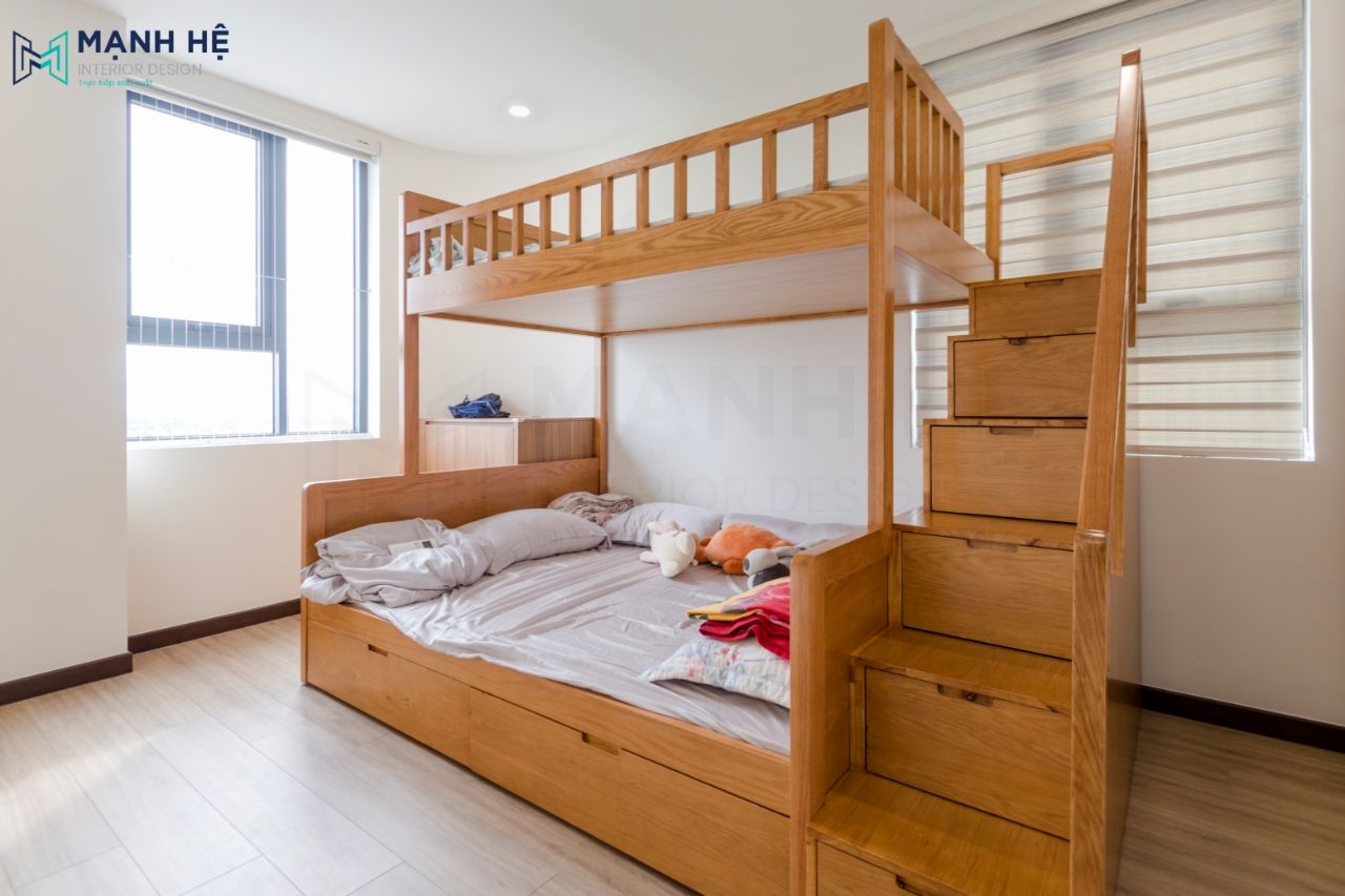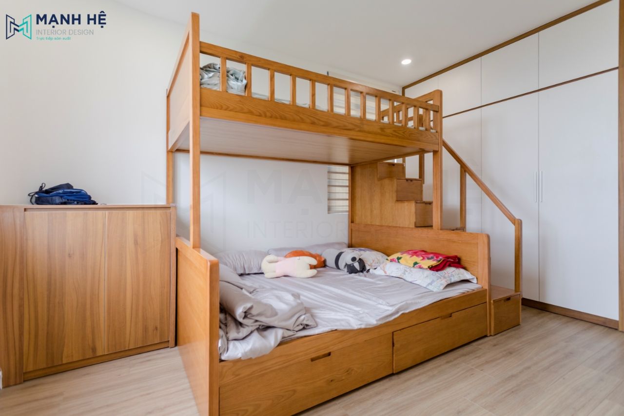 Phòng ngủ các bé được thiết kế theo phong cách đơn giản với tone gỗ chủ đạo