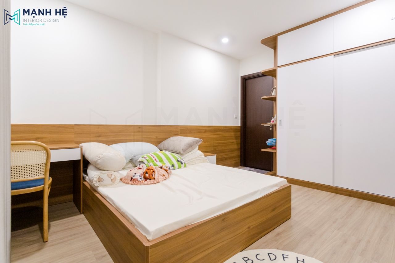 Vẫn là lối thiết kế đơn giản của phòng khách và tone màu gỗ chủ đạo, tuy nhiên phòng được thiết kế đầy đủ nội thất với giường tủ và một chiếc bàn làm việc nhỏ bên cạnh. Ốp đầu giường sử dụng gỗ tạo cảm giác hài hòa và kết nối các chi tiết trong căn phòng lại với nhau.