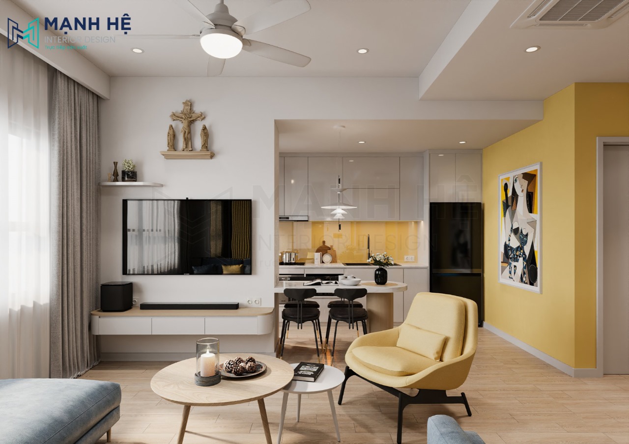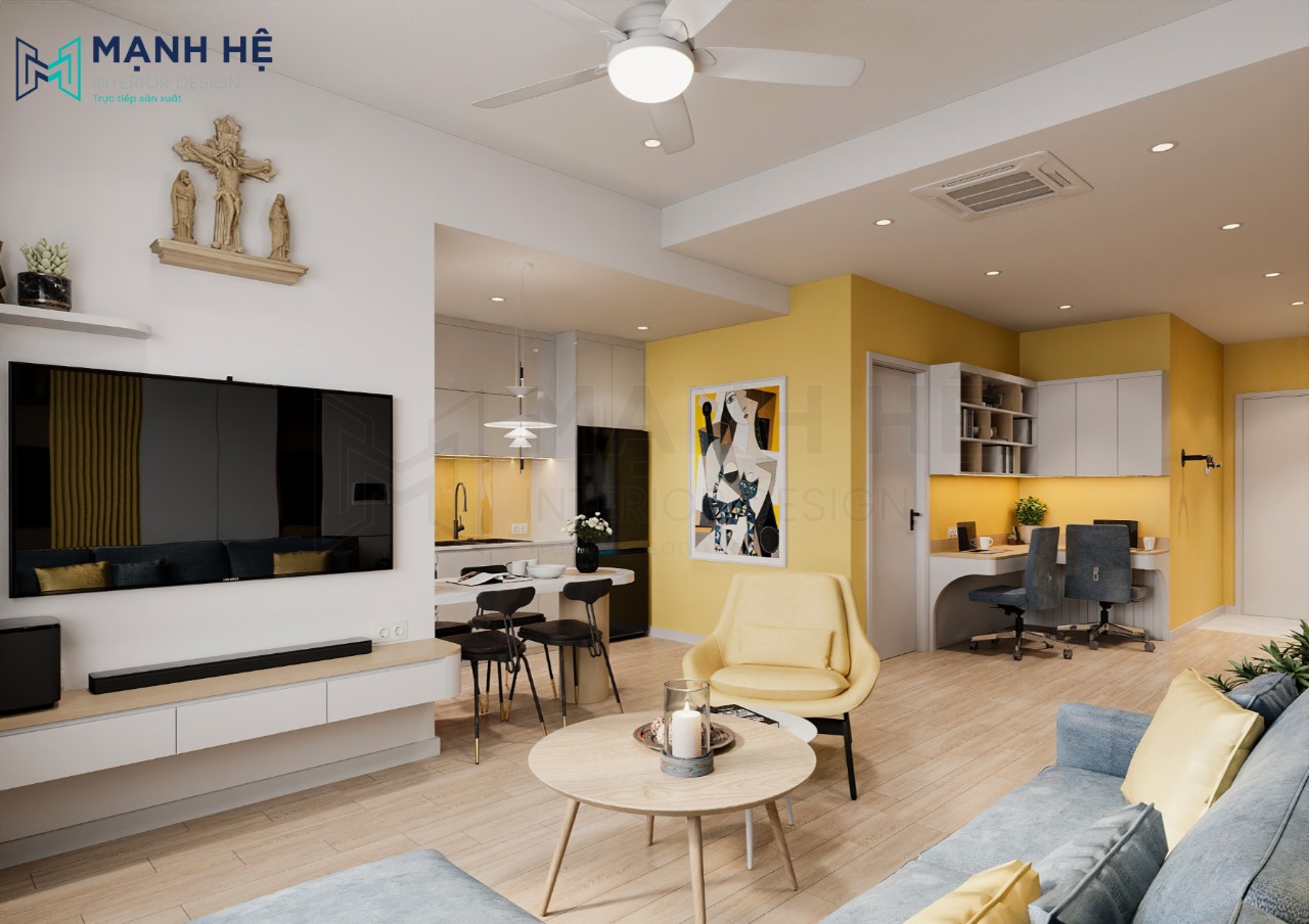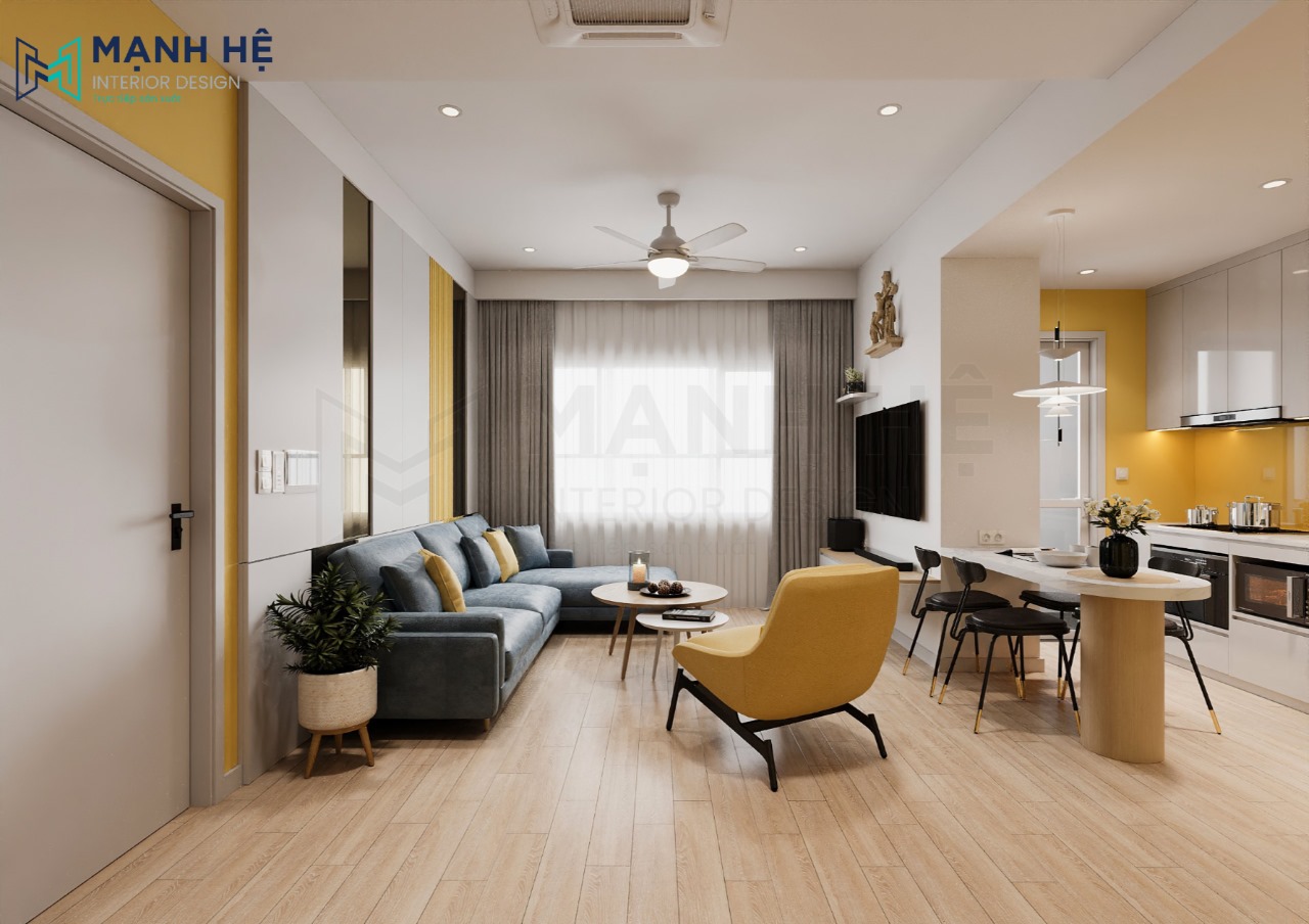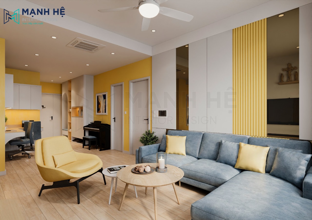 Thiết kế nội thất phòng khách chung cư với gam màu vàng chanh tươi sáng