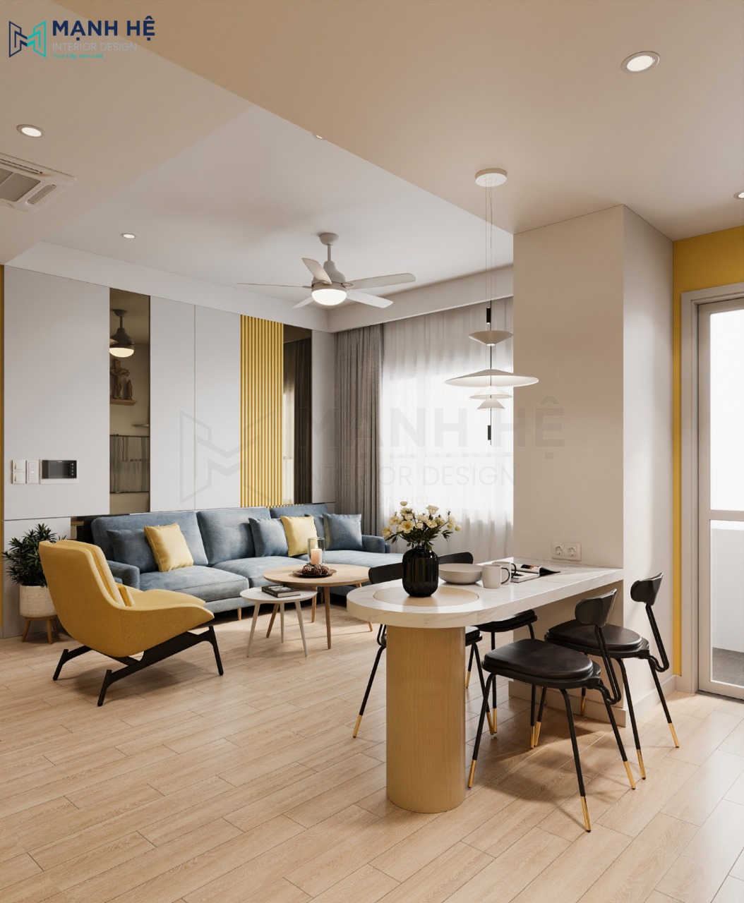 Căn hộ 72m2 Sunrise Riverside có diện tích vừa phải đủ để phục vụ sinh hoạt cho cả gia đình nên không gian được bố trí đơn giản mà đậm nét riêng theo màu xanh ưa chuộng của anh Sự. Hãy cùng với Mạnh Hệ xem qua ý tưởng căn hộ dành cho gia chủ yêu màu vàng nhé!