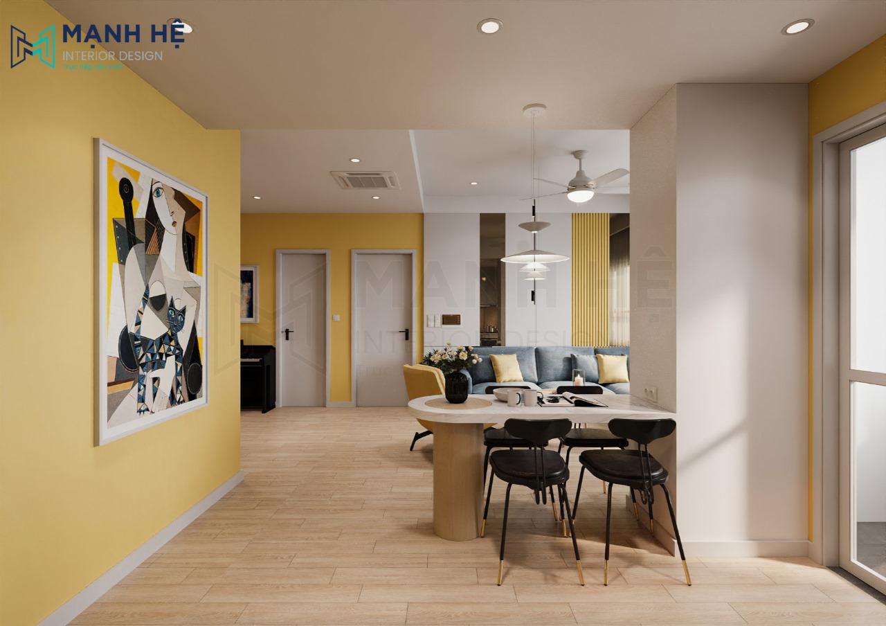 Phòng khách sử dụng màu trắng – vàng là gam màu chủ đạo. Màu vàng phong thủy và màu trắng tinh khôi kết hợp với nhau mang đến cảm giác mát mẻ, dễ chịu khi bước vào phòng. Bàn ăn nhỏ 4 ghế cùng hệ thống đèn trần giúp phân chia không gian phòng khách và phòng bếp khéo léo.