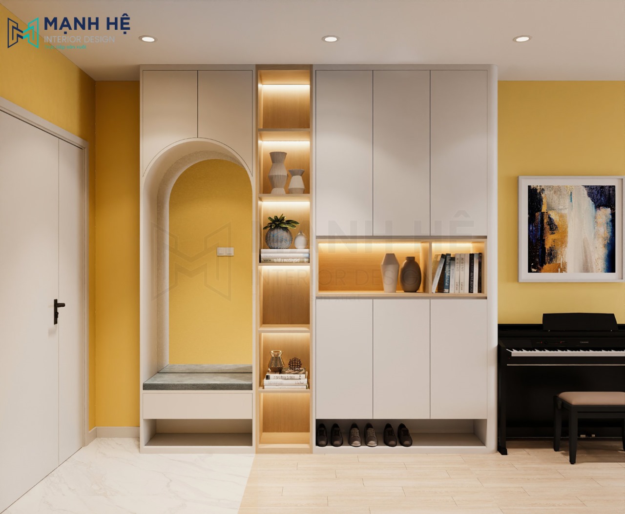 Hệ tủ giày kết hợp kệ trang trí và bục ngồi mang giày dép tiện nghi