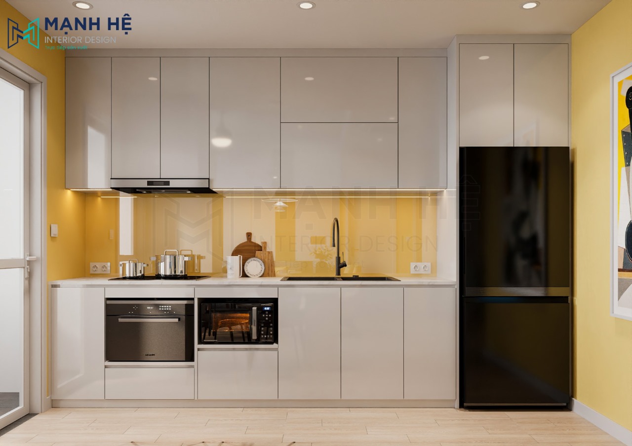 Tủ bếp chữ I được làm từ gỗ công nghiêp phủ acrylic màu xám sang trọng giúp bạn khi nấu ăn không còn gặp trở ngại dầu mỡ gây mất thẩm mỹ. Đây là kiểu dáng phổ biến nhất vì thiết kế nhỏ gọn cho không gian bếp có diện tích hạn chế.