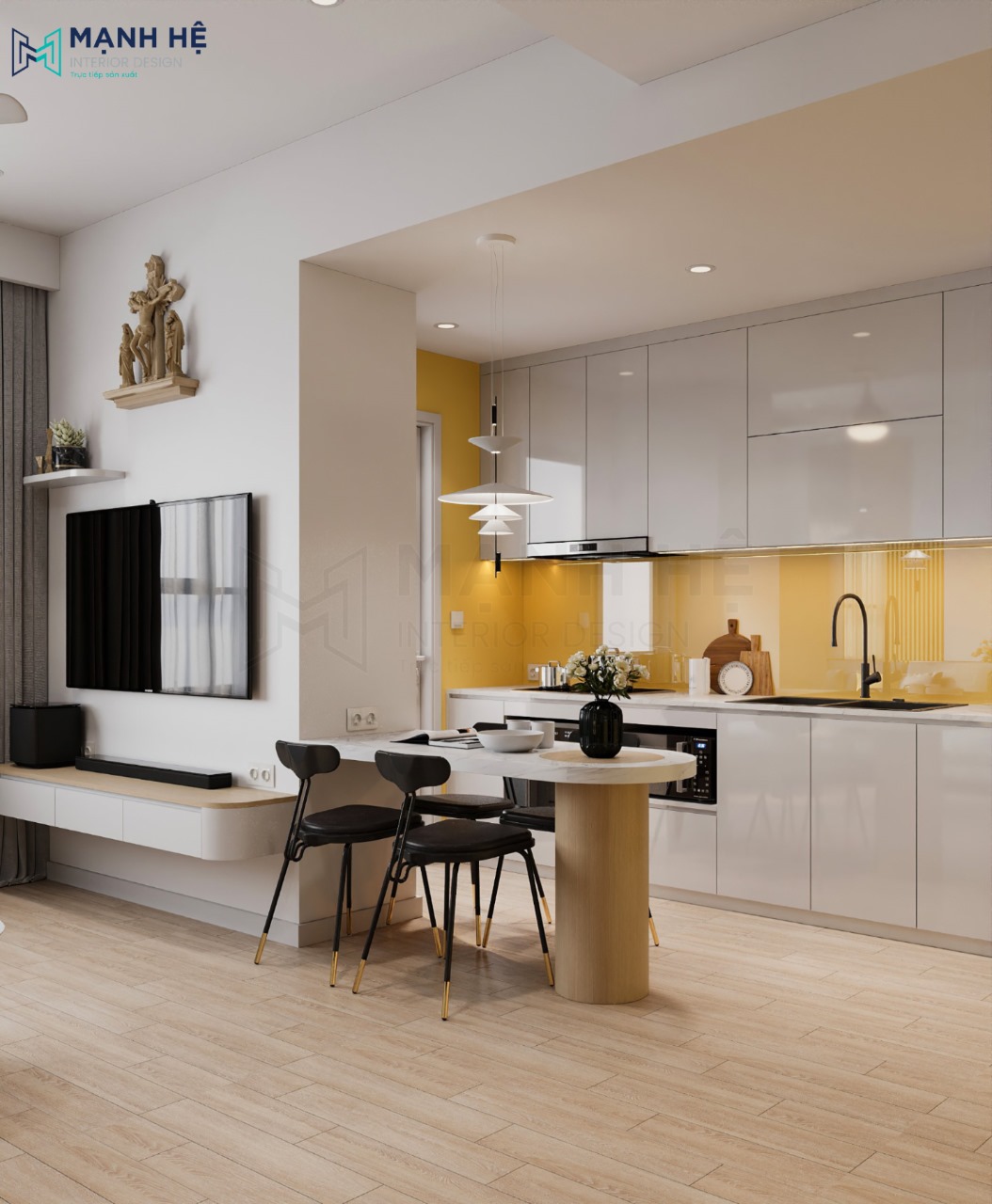 Giải pháp tối ưu diện tích về việc tận dụng sự kết hợp giữa phòng khách và phòng bếp đang trở thành xu hướng trong việc thiết kế nhà chung cư. Không gian phòng được anh Sự lựa chọn màu vàng hợp với mệnh Kim bởi anh quan niệm: Thiết kế màu hợp phong thủy giúp công danh, gia đình và sức khỏe theo chiều hướng tích cực.