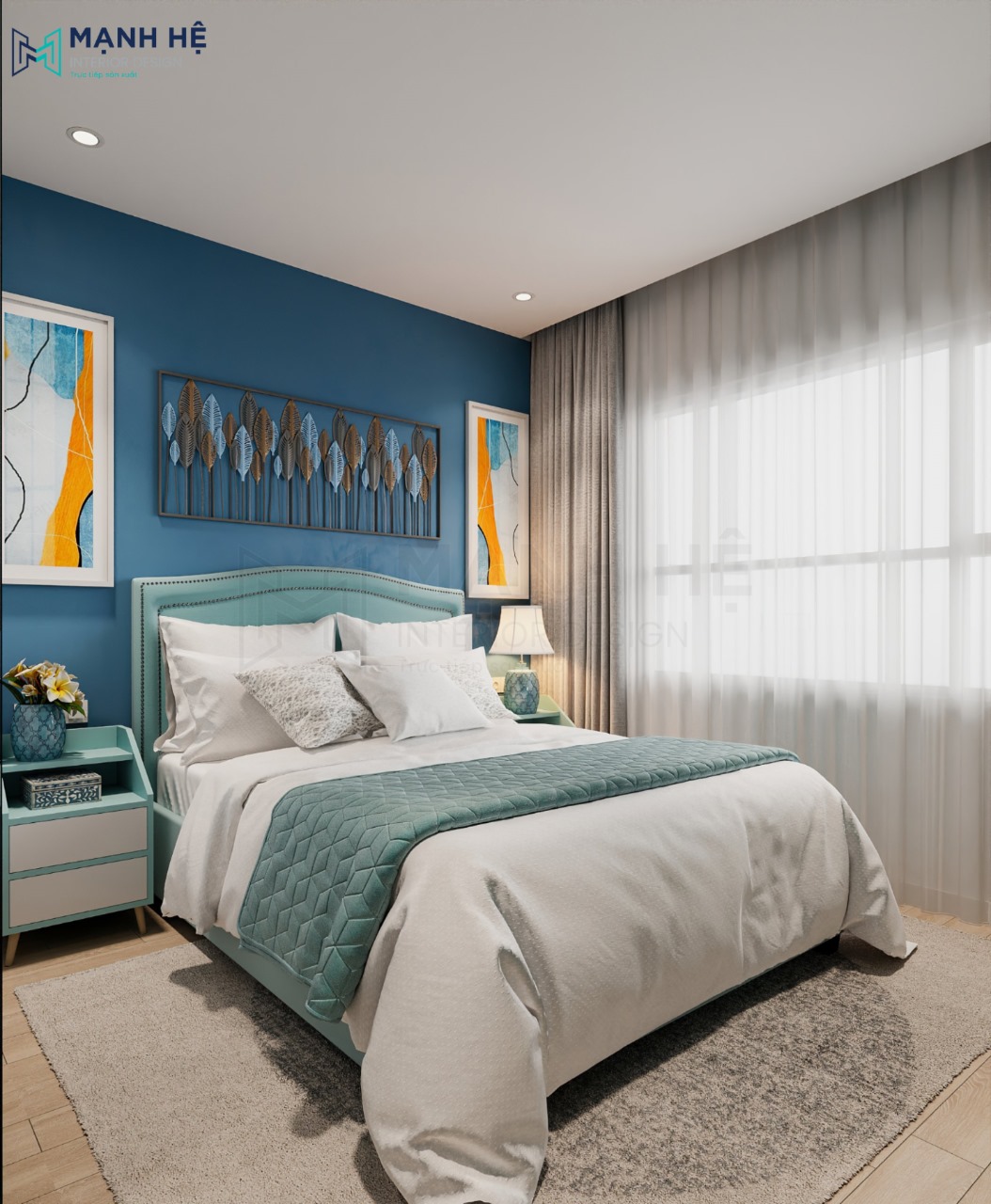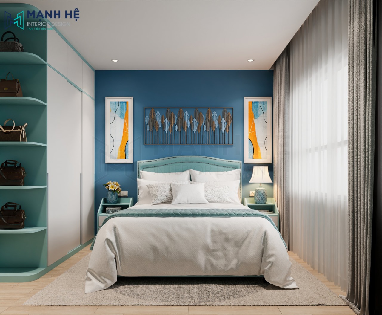 Thiết kế nội thất phòng ngủ master với gam màu xanh năng động