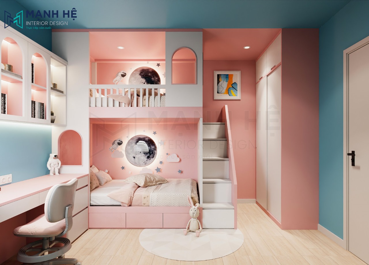 Không gian phòng ngủ cho bé đơn giản, nhẹ nhàng hơn với gam màu hồng xanh đáng yêu. Để phù hợp tính cách và nhu cầu của bé, Mạnh Hệ đã thiết kế bàn học và kệ sách gần giường tầng giúp bé sinh hoạt dễ hơn. Giường tầng với chất liệu bền bỉ cứng cáp dành cho 2 bé mang đến không gian ấm cúng, hiện đại.