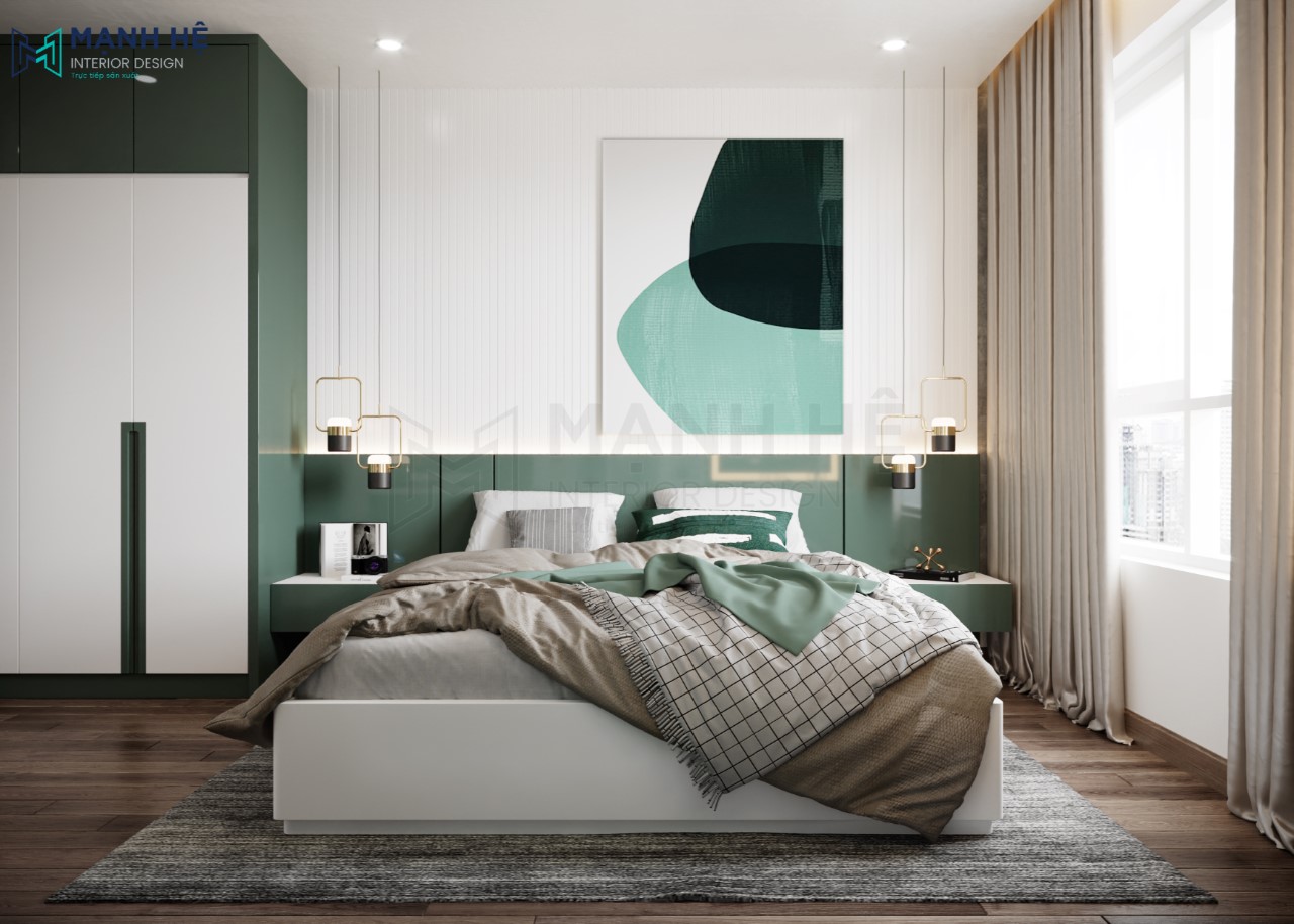 Phòng ngủ master với 2 gam màu xanh và trắng kết hợp. Thiết kế giường ngủ với tab đầu giường màu xanh. Tranh treo tường đơn giản nhưng cực thu hút. Tủ quần áo cao đụng trần giúp tối ưu diện tích căn phòng. Thảm lót sàn giúp căn phòng thêm tinh tế hơn.