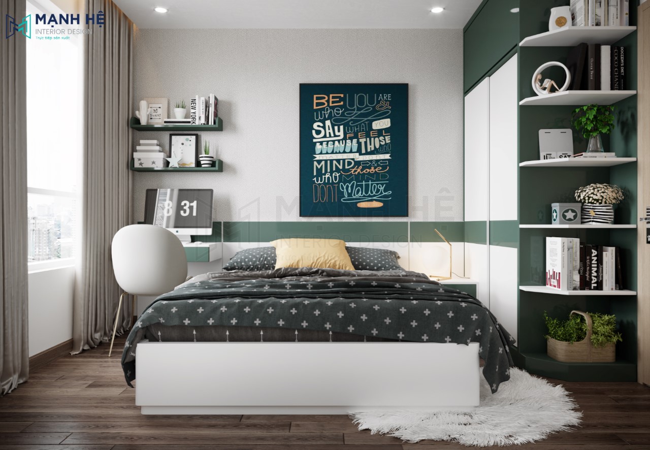 Phòng ngủ thứ 02 có diện tích tương đối nhỏ hơn phòng thứ 01 nhưng được thiết kế với phong cách nhẹ nhàng tương tự. Nội thất cơ bản gồm tủ quần áo, giường ngủ, kệ trang trí và bàn làm việc. Tủ quần áo cao đụng trần cánh lùa tích hợp thêm kệ trang trí. Bàn làm việc đặt cạnh cửa sổ thêm kệ sách treo tường.