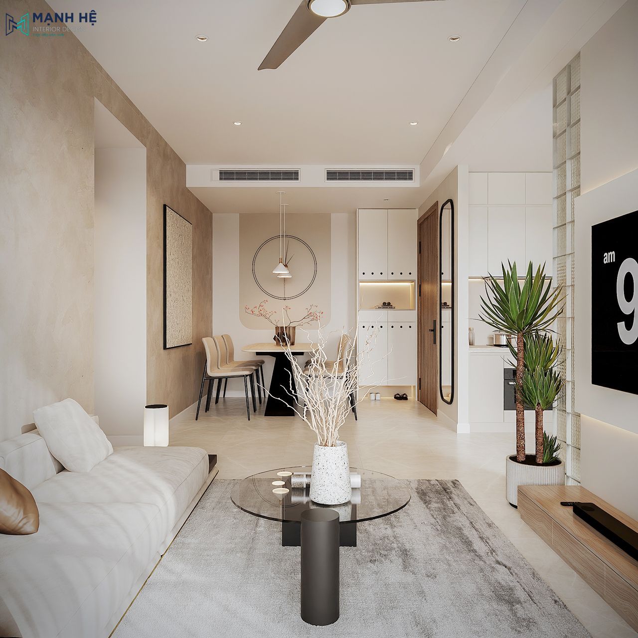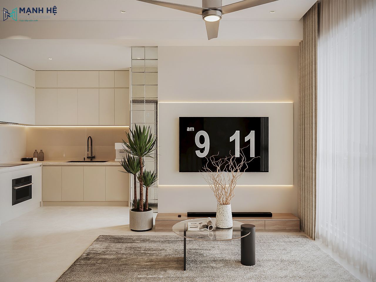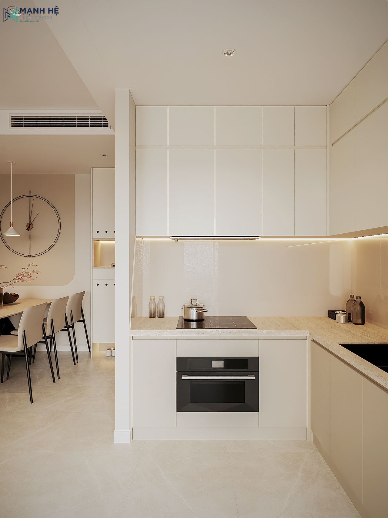 Đội ngũ đã lựa chọn thiết kế mở cho không gian phòng khách liền bếp để tạo sự kết nối liền mạch, quây quần giữa khu vực tiếp khách – bếp và bàn ăn, đúng như mong muốn của gia chủ. Để bầu không khí thêm ấm cúng, Mạnh Hệ đã sử dụng tông màu trung tính chủ đạo như kem, be, xám mang đến cảm giác nhẹ nhàng, làm nổi bật nội thất.